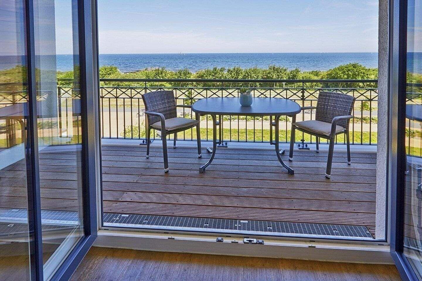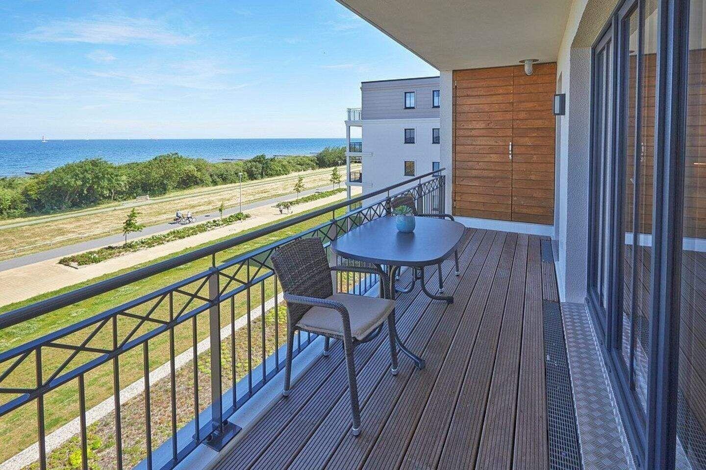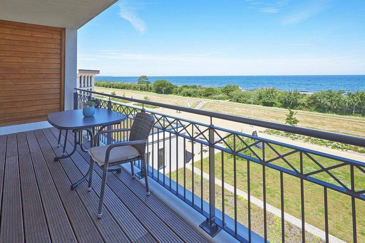 Nach einem erholsamen Urlaubstag lässt es sich auf dem mit Gartenmöbeln ausgestatteten Balkon mit einmalig schönem Meerblick herrlich entspannen. Der Balkon ist sowohl vom Wohn- als auch vom Schlafzimmer begehbar. Die Waterkant Suites liegen an der Promenade in Börgerende und somit direkt am Meer.