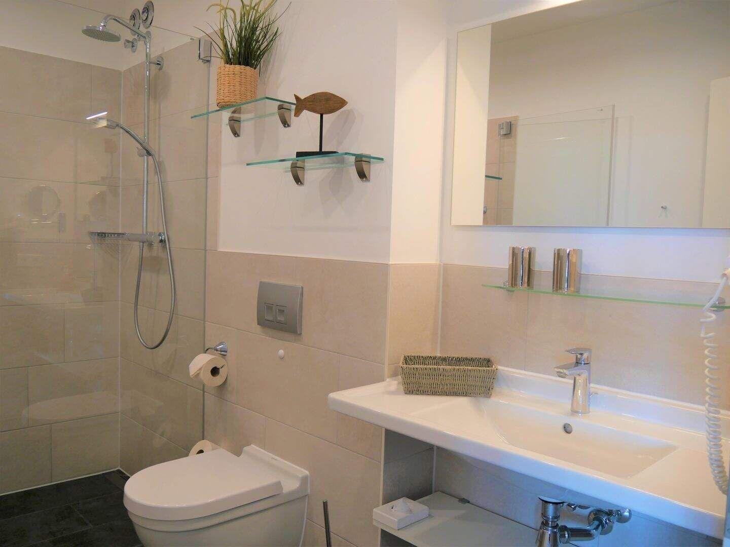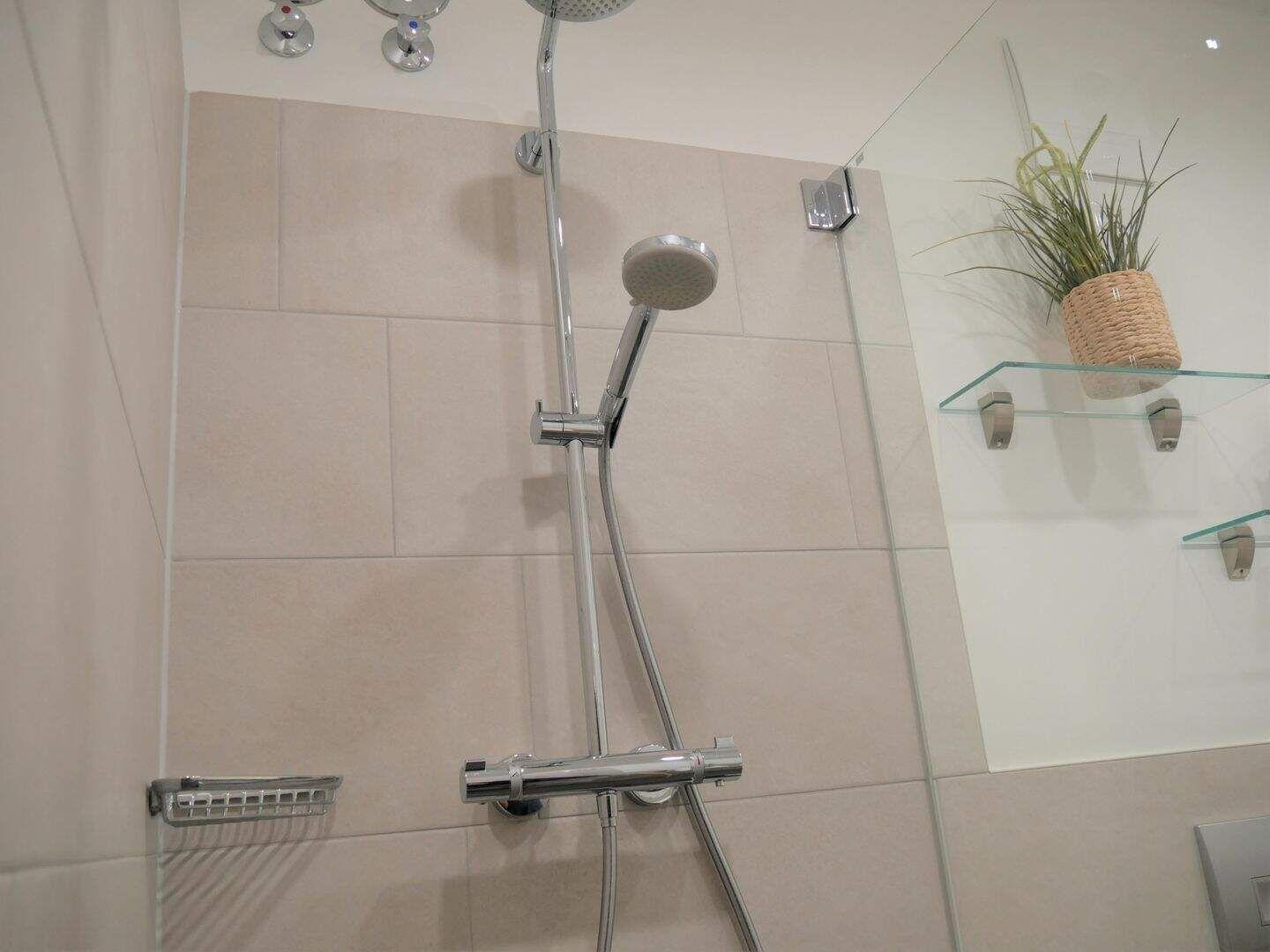 Die offene Regendusche ist das Highlight der Wohnung. Das Badezimmer ist ausgestattet mit einem Handtuchwärmer, einem Waschtisch mit Kosmetikspiegel und einem Haartrockner.