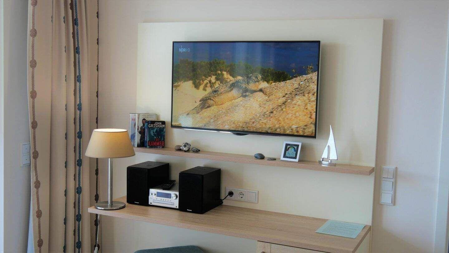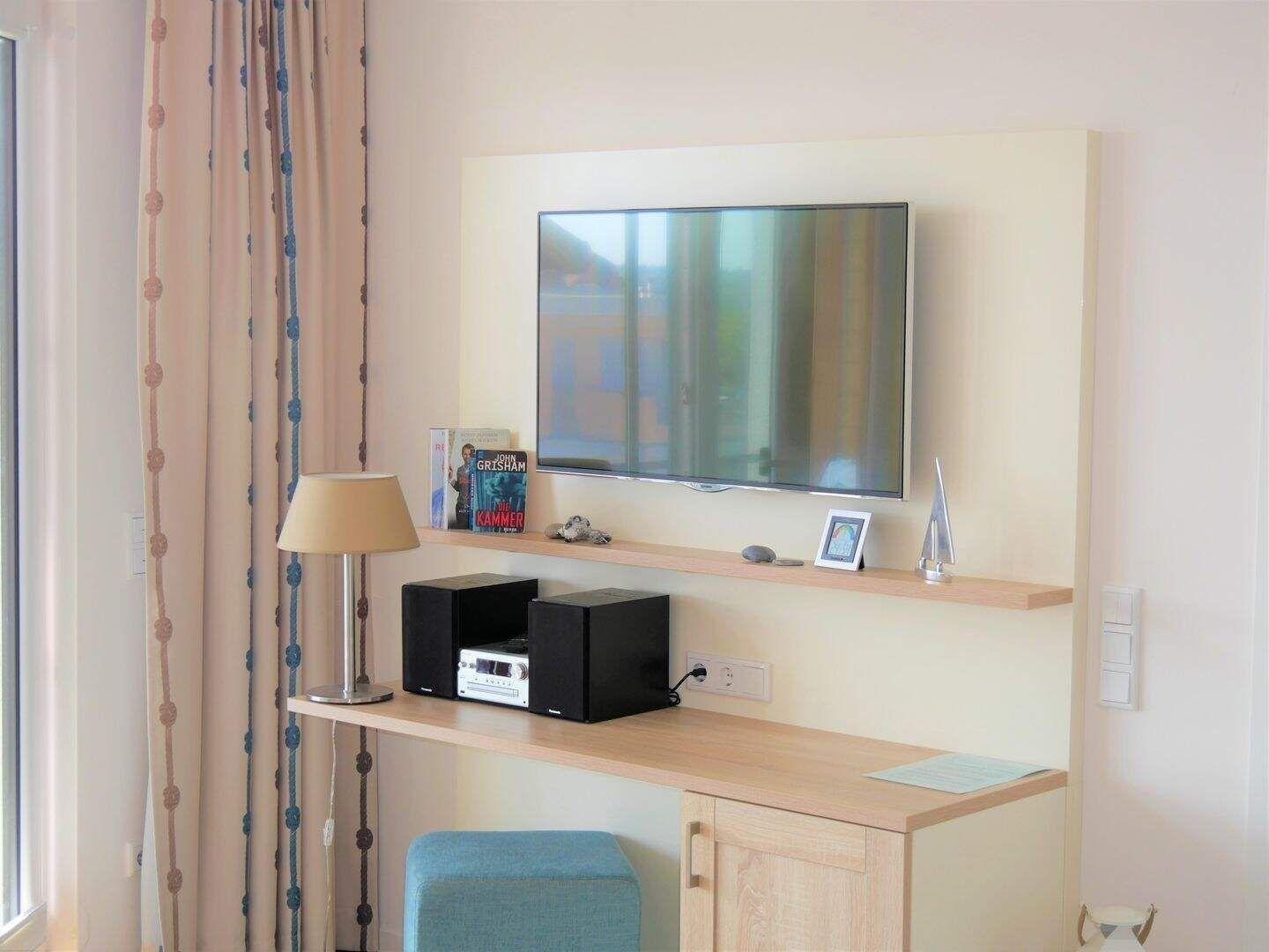 Das Schlafzimmer bietet ein modernes Boxspringbett (1,80m x 2,10m), auf welchem Sie süße Träume haben werden. Auch im Schlafzimmer gibt es einen Flatscreen-TV zu Ihrem Entertainment. Ein Kinderbett sowie ein Hochstuhl können auf Anfrage hinzugebucht werden.