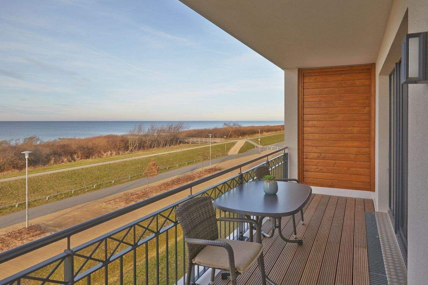 Der überdachte Balkon ist sowohl vom Wohnzimmer als auch vom Schlafzimmer aus begehbar. Natürlich stehen Ihnen hier auch Terrassenmöbel zur Verfügung, sodass Sie beispielsweise Ihr Frühstück oder Ihr Abendessen ganz privat im Sonnenschein zu sich nehmen können. Die Waterkant Suites liegen an der Promenade in Börgerende und somit direkt am Meer.