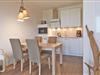 Die offene Küche mit integriertem Essbereich besitzt einen Geschirrspüler, Gefrierfach, Toaster, Kaffeemaschine, Mikrowelle, 2-Platten-Ceranfeld und Wasserkocher.