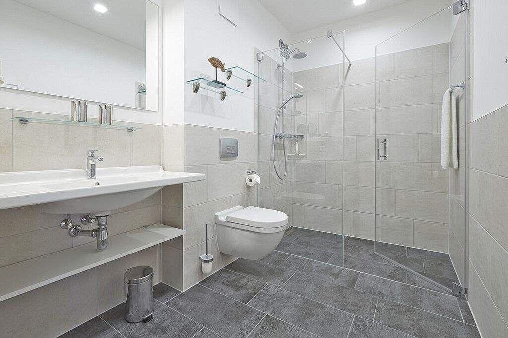 Die offene Regendusche ist das Highlight der Wohnung. Das Badezimmer ist ausgestattet mit einem Handtuchwärmer, einem Waschtisch mit Kosmetikspiegel und einem Haartrockner.
