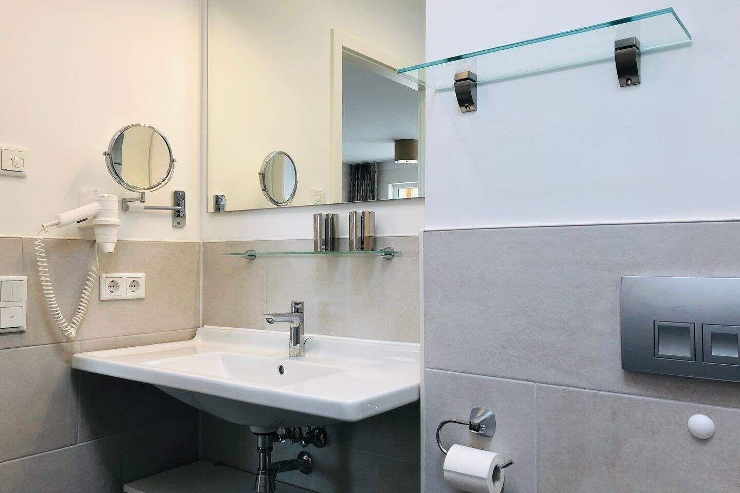 Die offene Regendusche ist das Highlight der Wohnung. Das Badezimmer ist ausgestattet mit einem Handtuchwärmer, einem Waschtisch mit Kosmetikspiegel und einem Haartrockner.