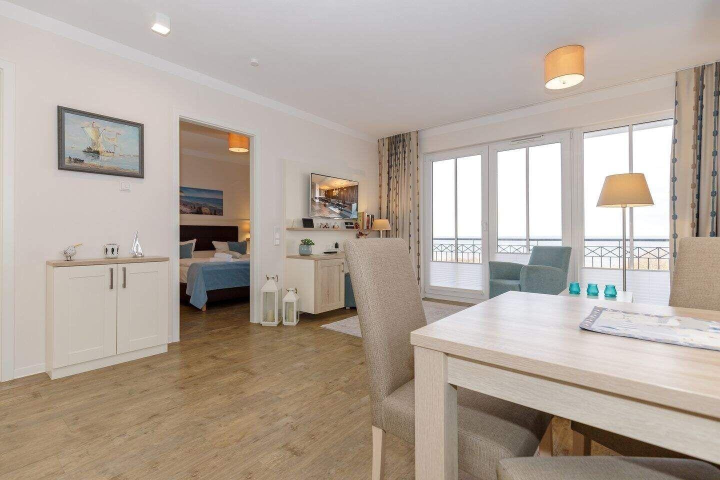 Der überdachte Balkon ist sowohl vom Wohnzimmer als auch vom Schlafzimmer aus begehbar. Natürlich stehen Ihnen hier auch Terrassenmöbel zur Verfügung, sodass Sie beispielsweise Ihr Frühstück oder Ihr Abendessen ganz privat im Sonnenschein zu sich nehmen können. Die Waterkant Suites liegen an der Promenade in Börgerende und somit direkt am Meer.