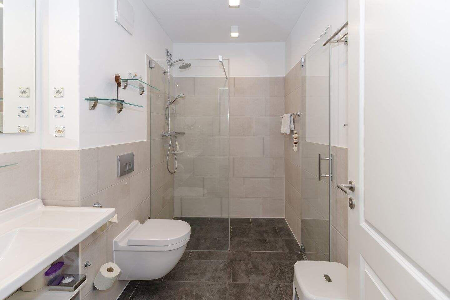 Die offene Regendusche ist das Highlight des Badezimmers. Es ist weiterhin ausgestattet mit einem Handtuchwärmer, einem Waschtisch mit Kosmetikspiegel und einem Haartrockner.