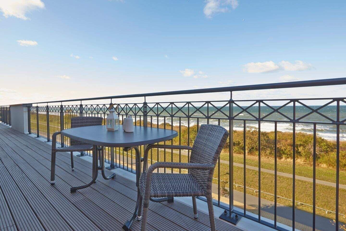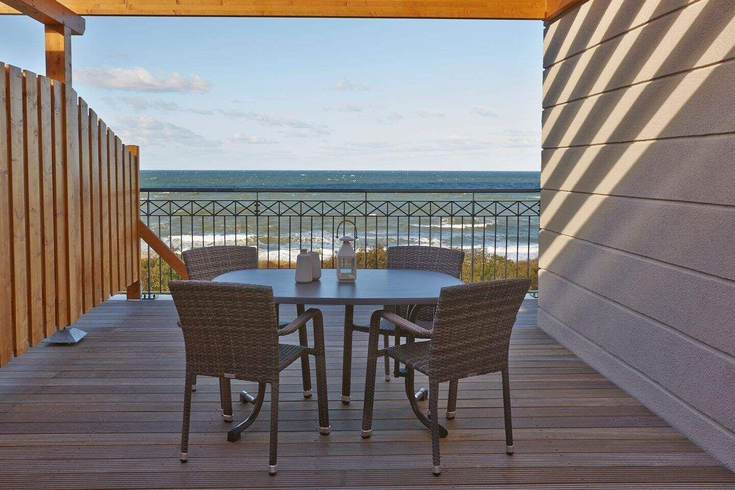 Die Dachterrasse ist sowohl vom Wohnzimmer als auch vom ersten Schlafzimmer aus begehbar. Natürlich stehen Ihnen hier auch Terrassenmöbel zur Verfügung sodass Sie beispielsweise Ihr Frühstück oder Ihr Abendessen ganz privat im Sonnenschein und mit Blick auf die Ostsee zu sich nehmen können. Die Waterkant Suites liegen an der Promenade in Börgerende und somit direkt am Meer.