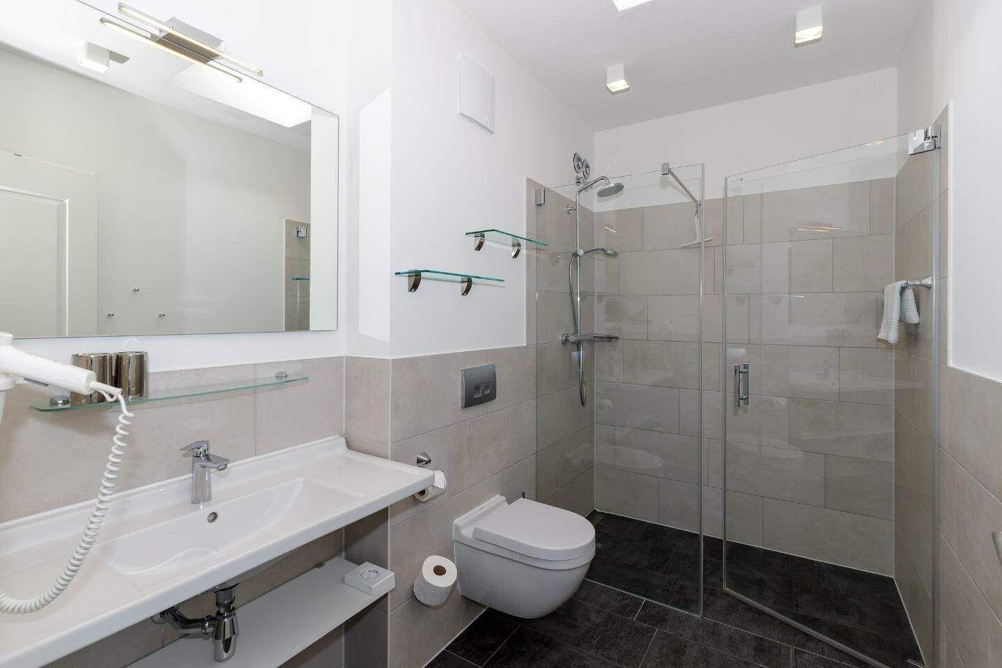 Die offene Regendusche ist das Highlight der Wohnung. Das Badezimmer ist ausgestattet mit einem Handtuchwärmer, einem Waschtisch mit Kosmetikspiegel und einem Haartrockner.