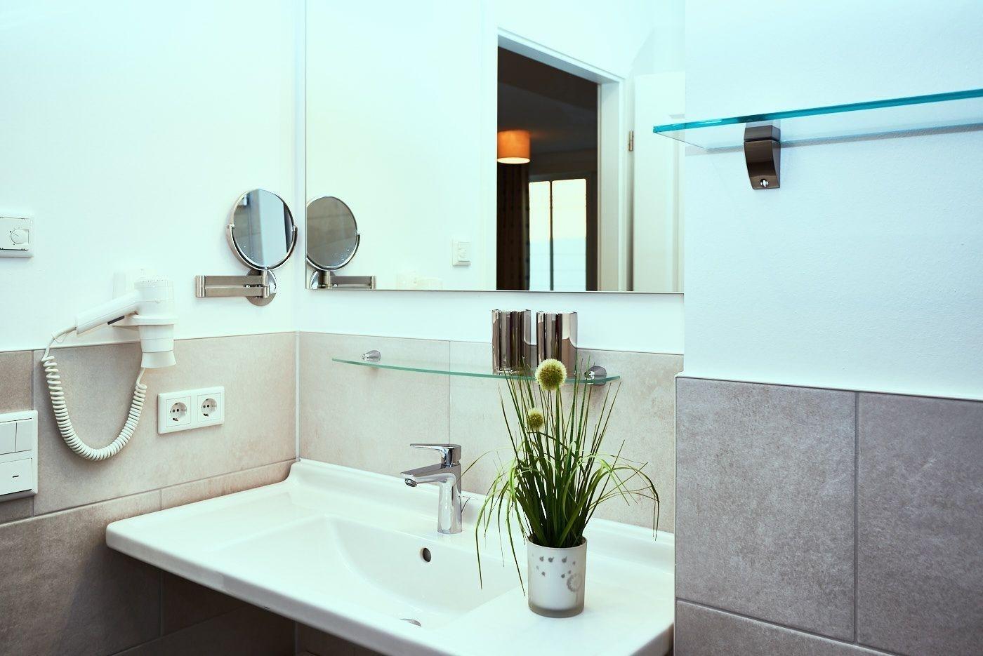 Die offene Regendusche ist das Highlight des Badezimmers. Es ist weiterhin ausgestattet mit einem Handtuchwärmer, einem Waschtisch mit Kosmetikspiegel und einem Haartrockner.