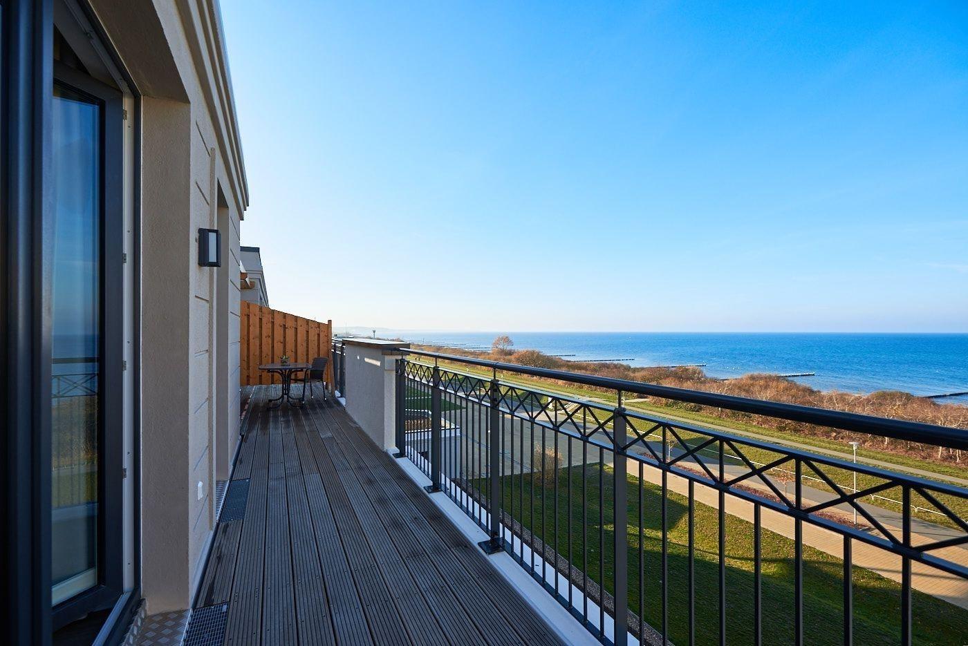 Die Dachterrasse ist sowohl vom Wohnzimmer als auch vom Schlafzimmer aus begehbar. Natürlich stehen Ihnen hier auch Terrassenmöbel zur Verfügung sodass Sie beispielsweise Ihr Frühstück oder Ihr Abendessen ganz privat im Sonnenschein und mit Blick auf die Ostsee zu sich nehmen können. Die Waterkant Suites liegen an der Promenade in Börgerende und somit direkt am Meer.
