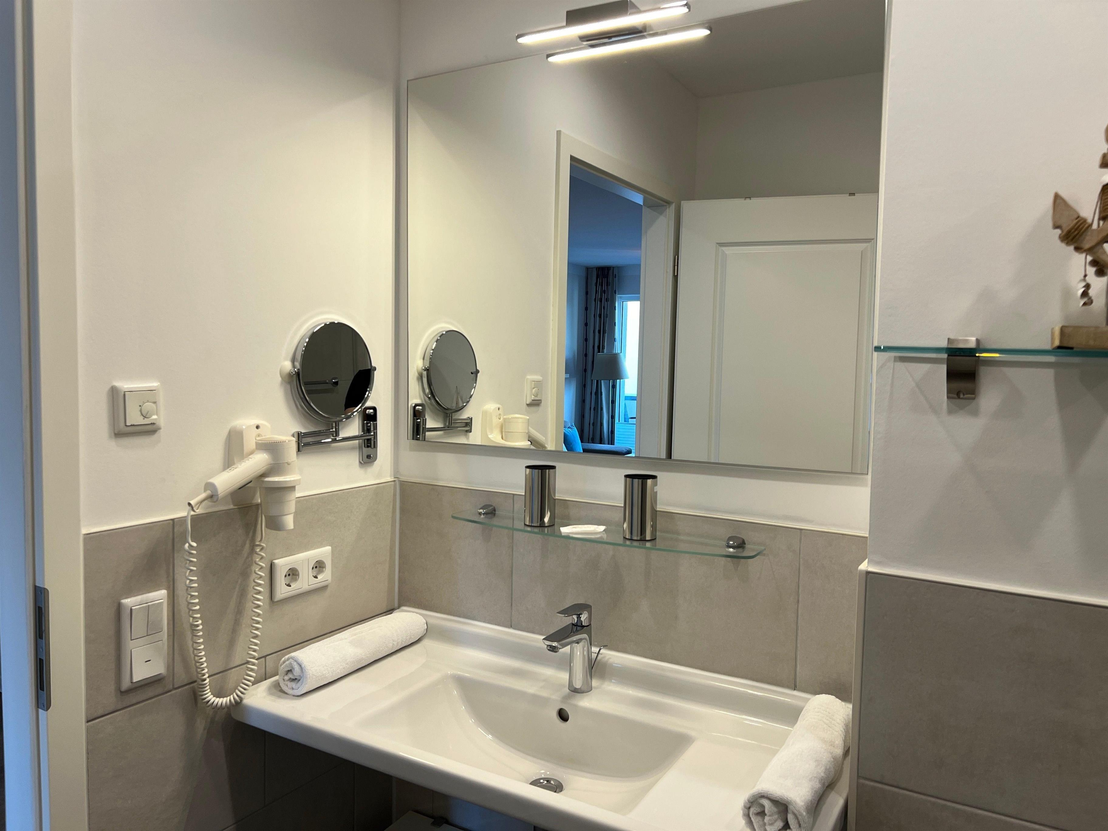 Im geräumigen Bad befinden sich eine großzügige, ebenerdige Regendusche, ein Handtuchtrockner, ein Waschtisch mit Föhn und Kosmetikspiegel.