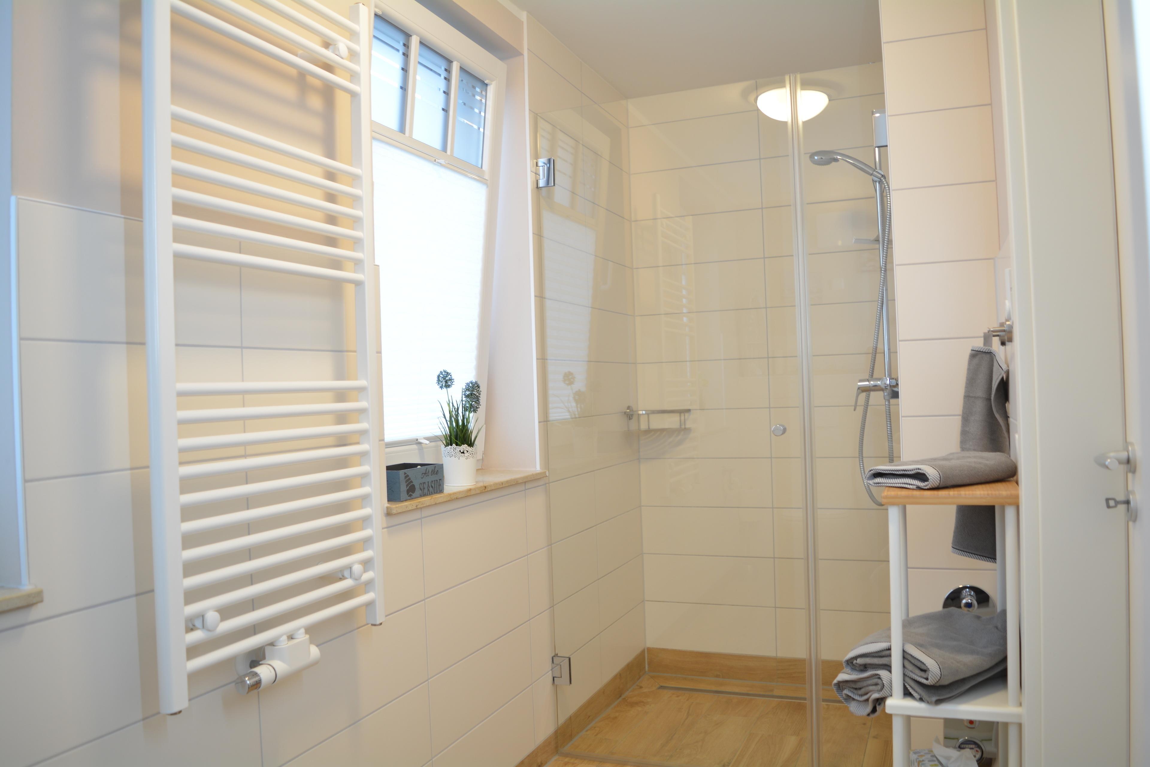 Selbstverständlich ist die Wohnung mit einem modernen Duschbad eingerichtet - Handtuchtrockner, Fön und kleine Extras sorgen für Ihr Wohlbefinden. In der gesamten Wohnung gibt es Fußbodenheizung
