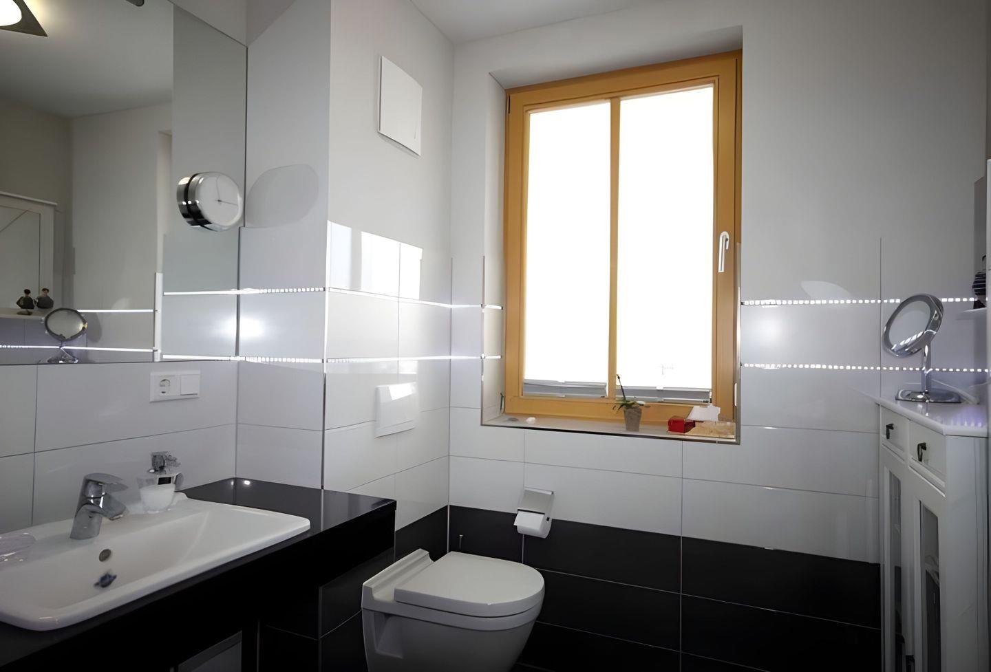 gestalteten Fliesenwände mit LED-Licht machen aus dem Bad eine Wohlfühloase.