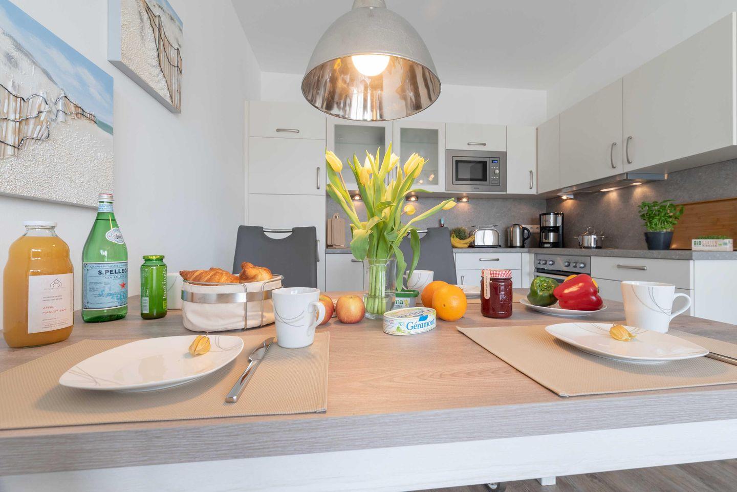 Dunstabzugshaube. Der große Esstisch lädt zu gemeinsamen Mahlzeiten und