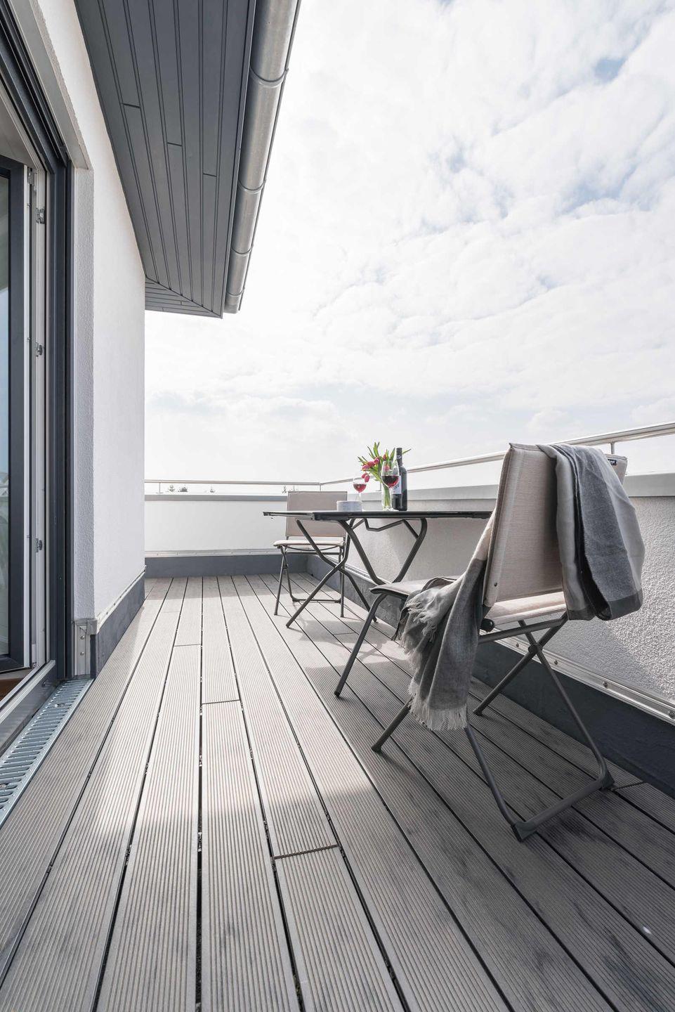 hier aus gelangen Sie auf die umlaufende Dachterrasse mit Tisch, vier Stühlen