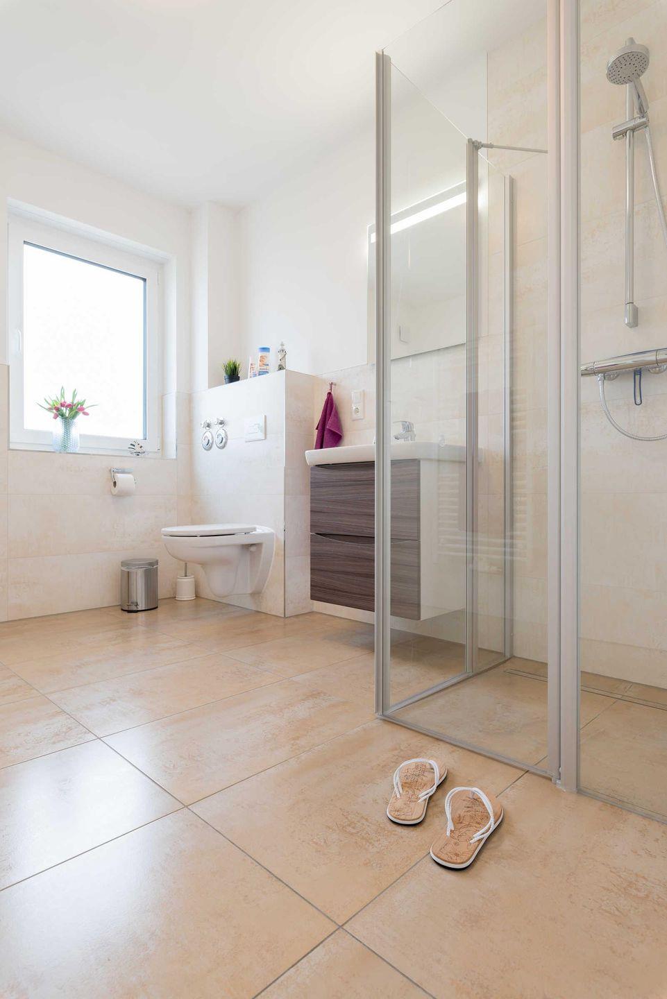 Das ca. 8 qm messende Bad ist mit einer geräumigen Dusche, einer Waschmaschine