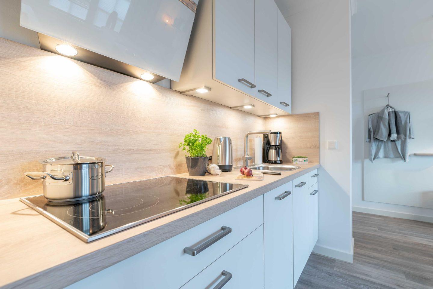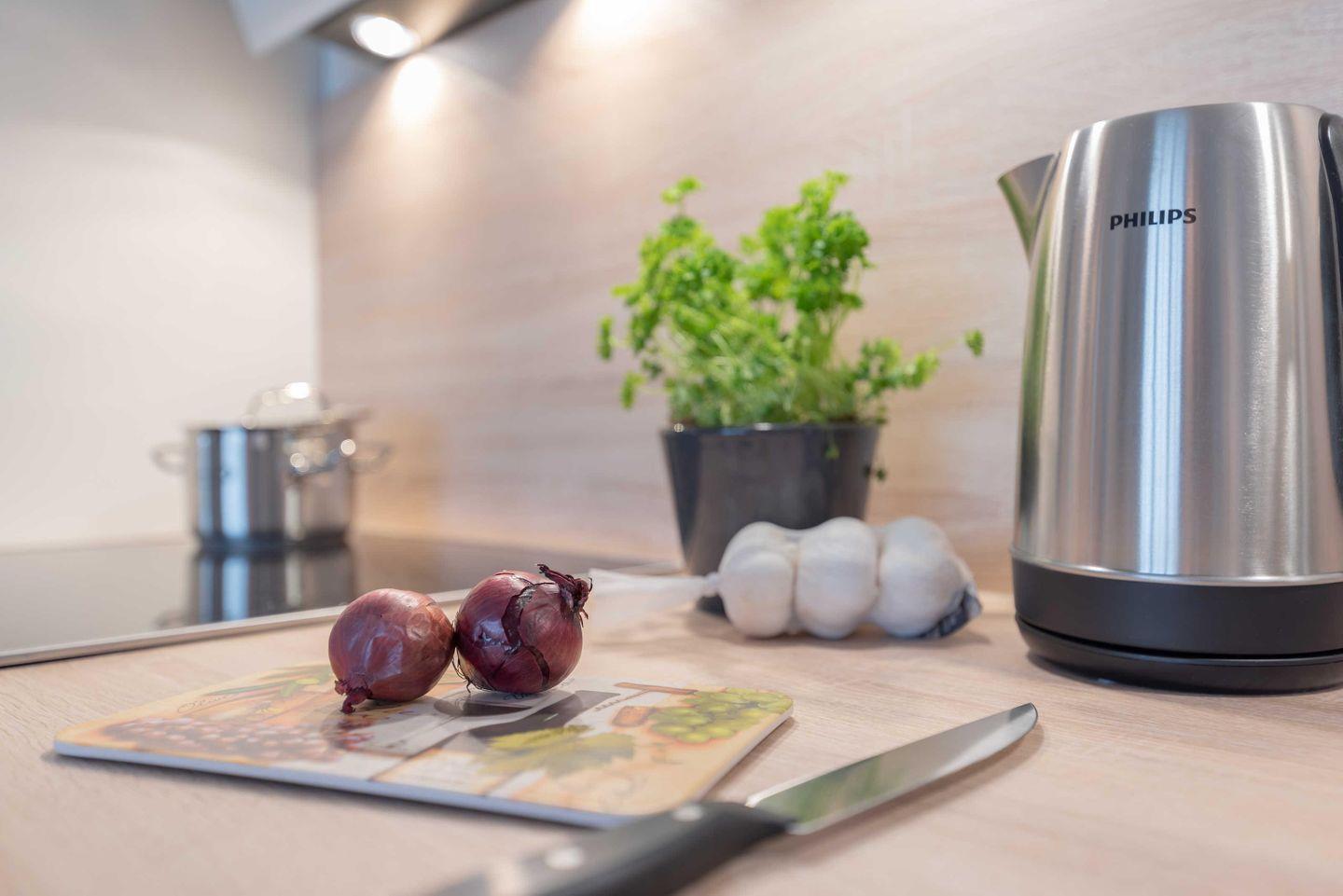 hochwertiger und voll ausgestatteter Einbauküche sowie Zugang zum Balkon. Eine