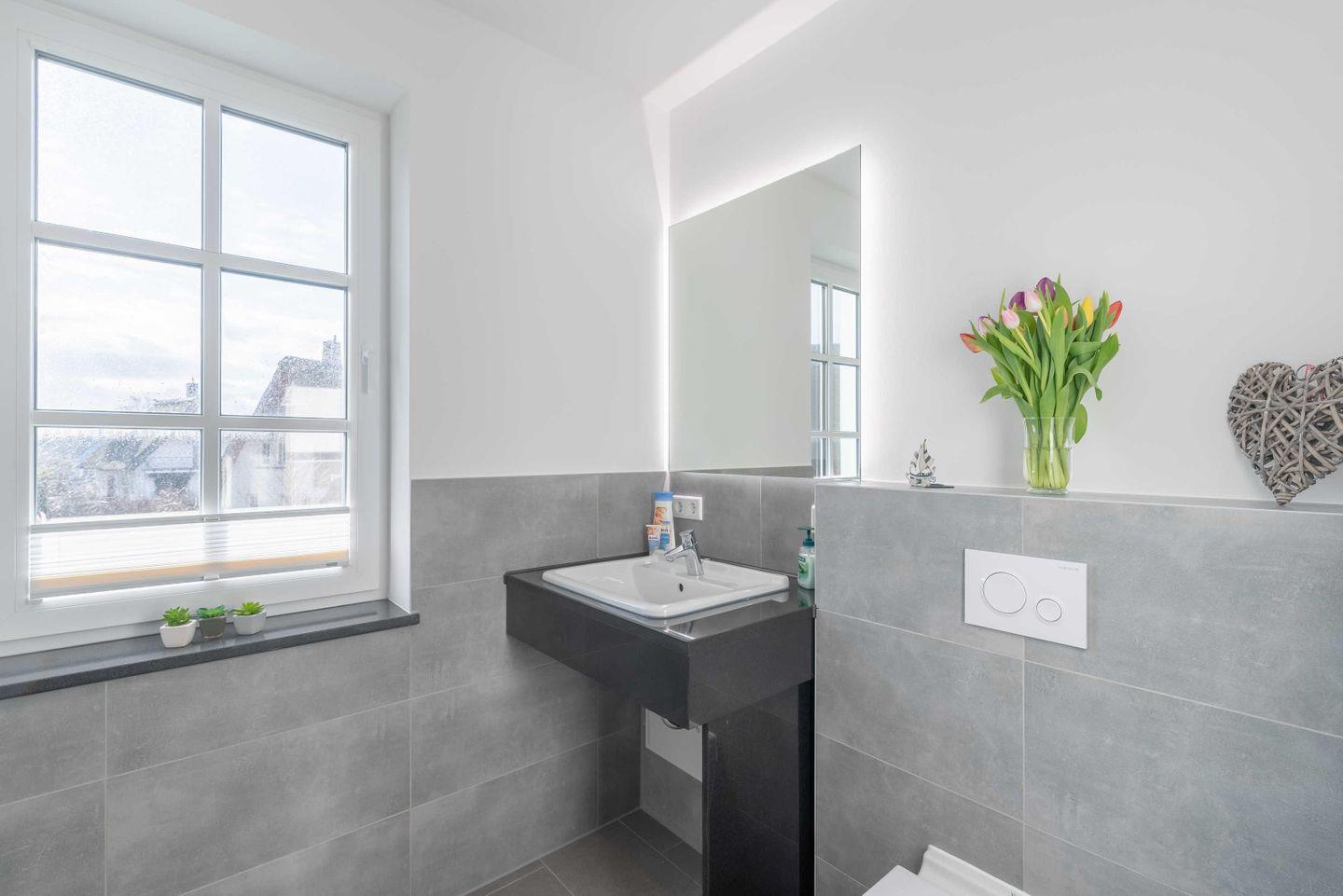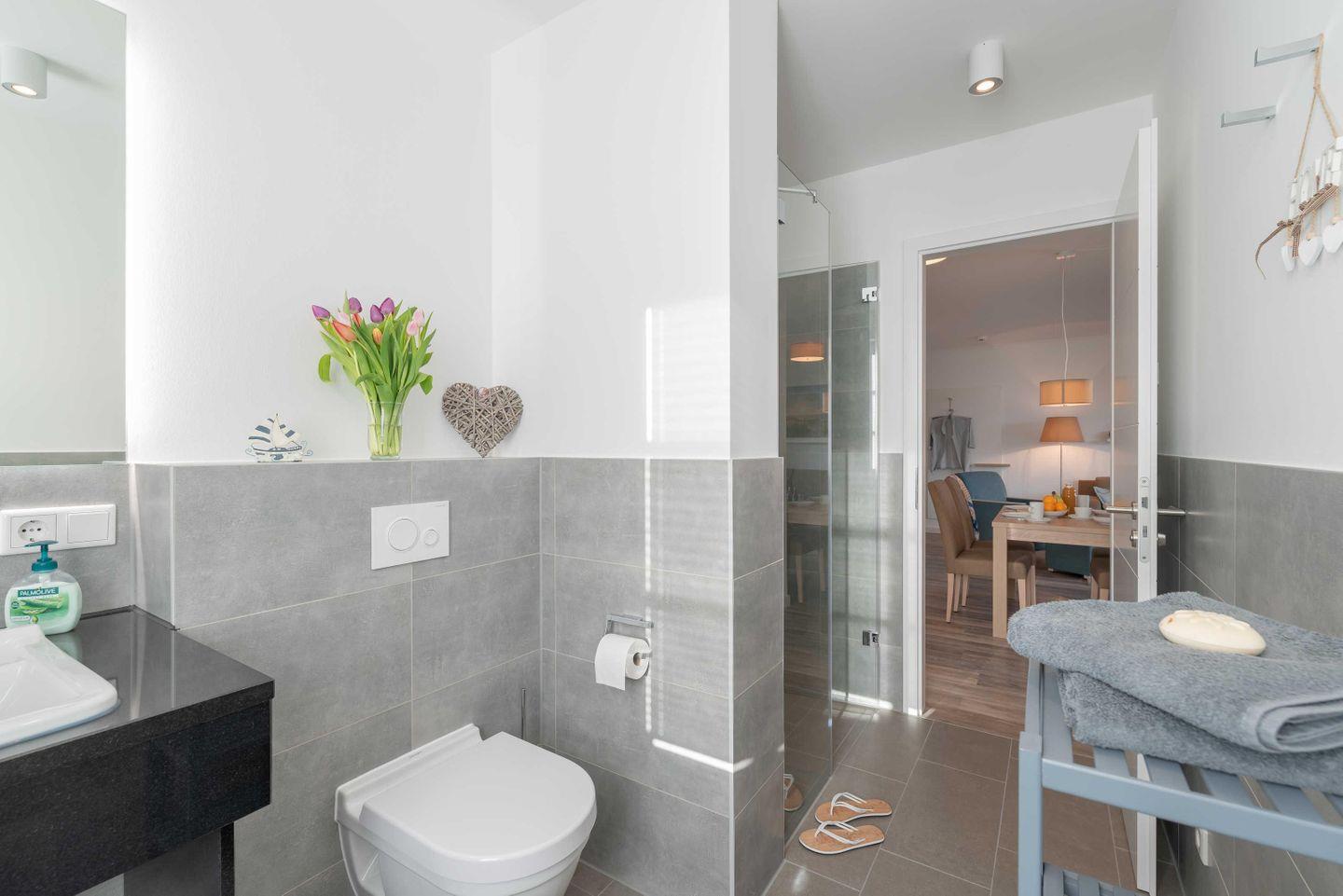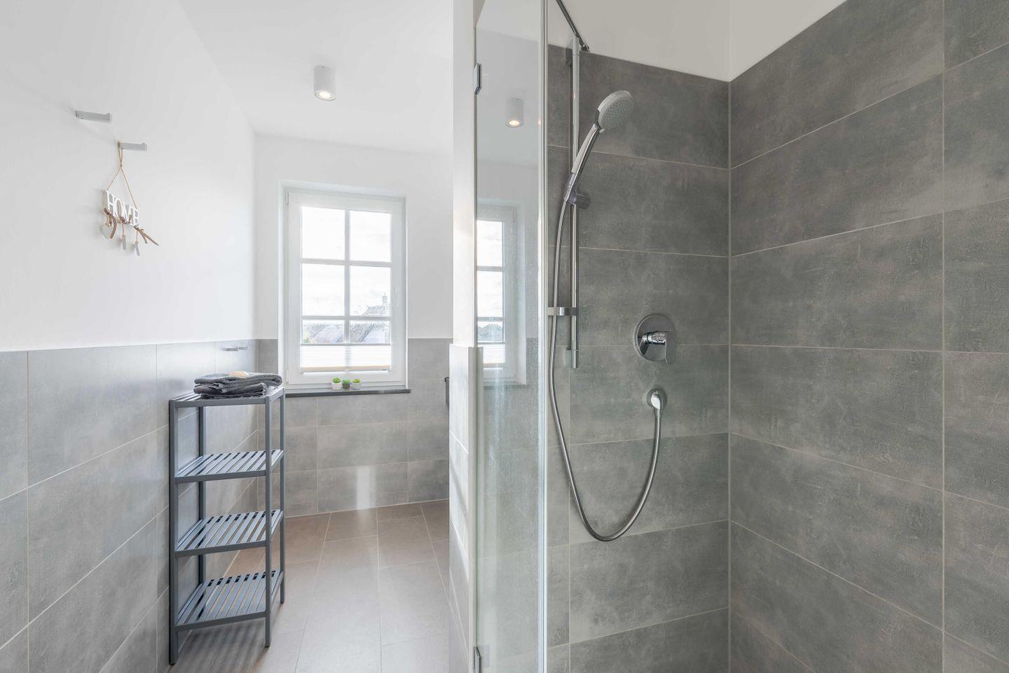 Das Badezimmer mit bodengleicher und geräumiger Dusche verfügt über einen