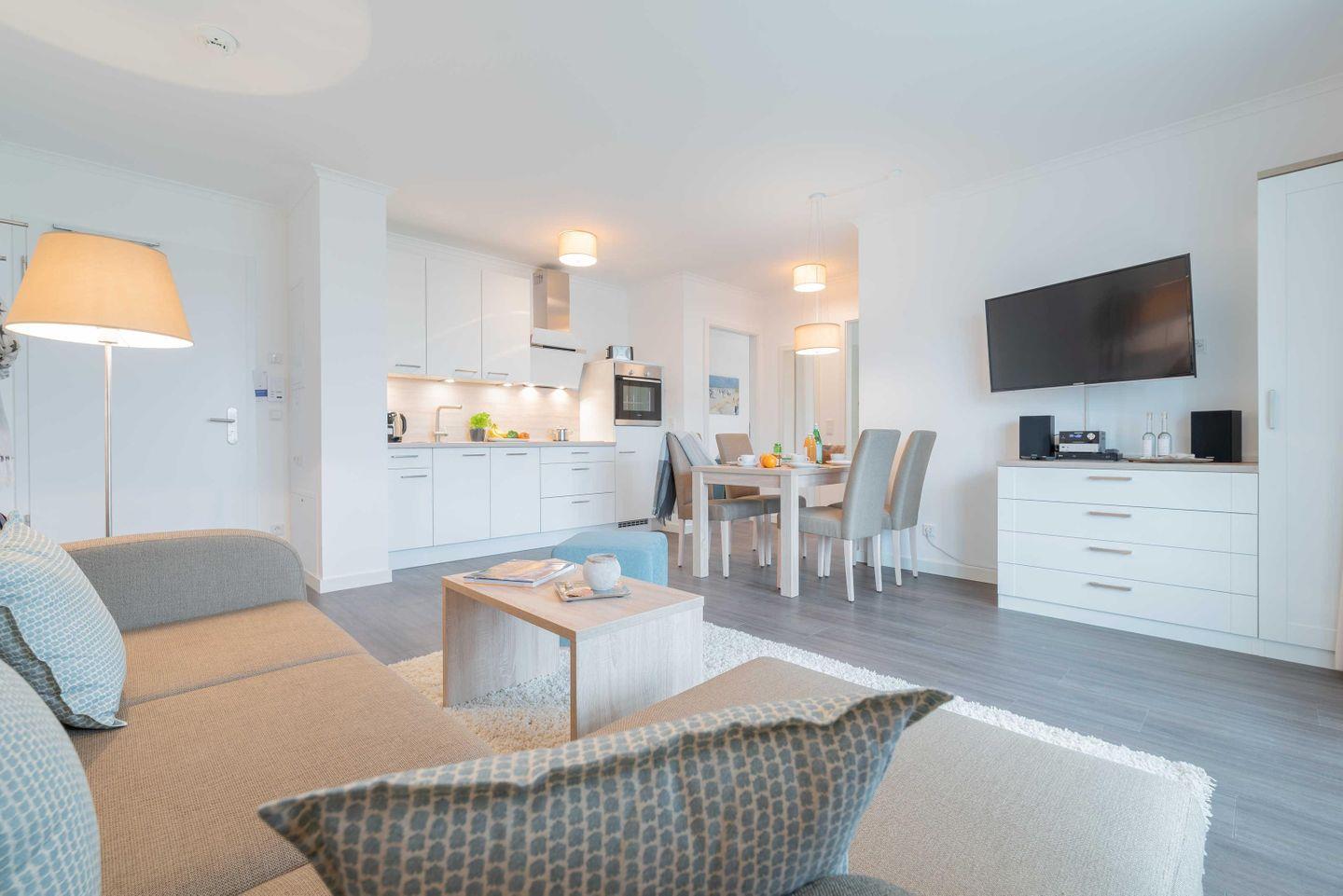 Der offene Bereich von Wohnzimmer und Küche ist geschmackvoll gestaltet.
