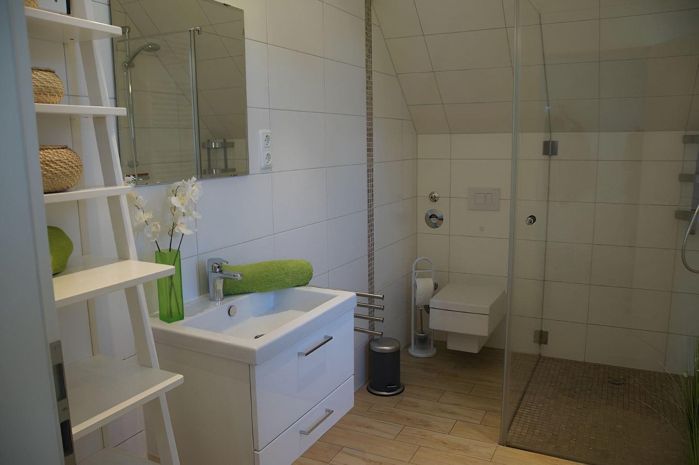 Dusche ist mit einem Handtuchheizkörper und einem Fön ausgestattet. Das