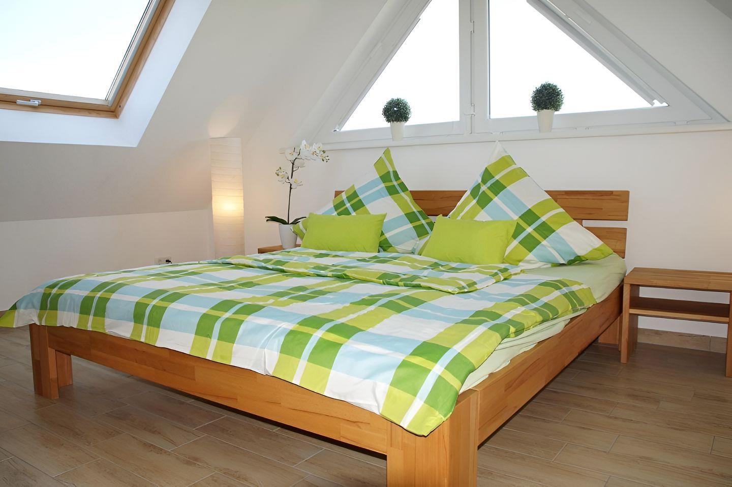 Schlafzimmer mit Doppelbett verfügt über einen geräumigen Kleiderschrank sowie