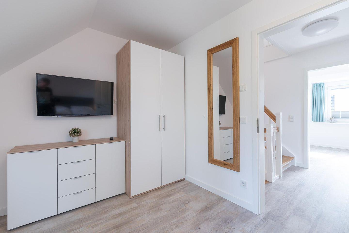 Kleiderschrank und Schuhschrank möbliert. Rechts von der Diele ist ein Gäste-WC
