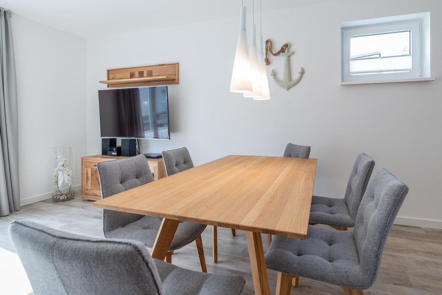 Verweilen ein. Hierzu gehören ein großer Massivholztisch mit sechs