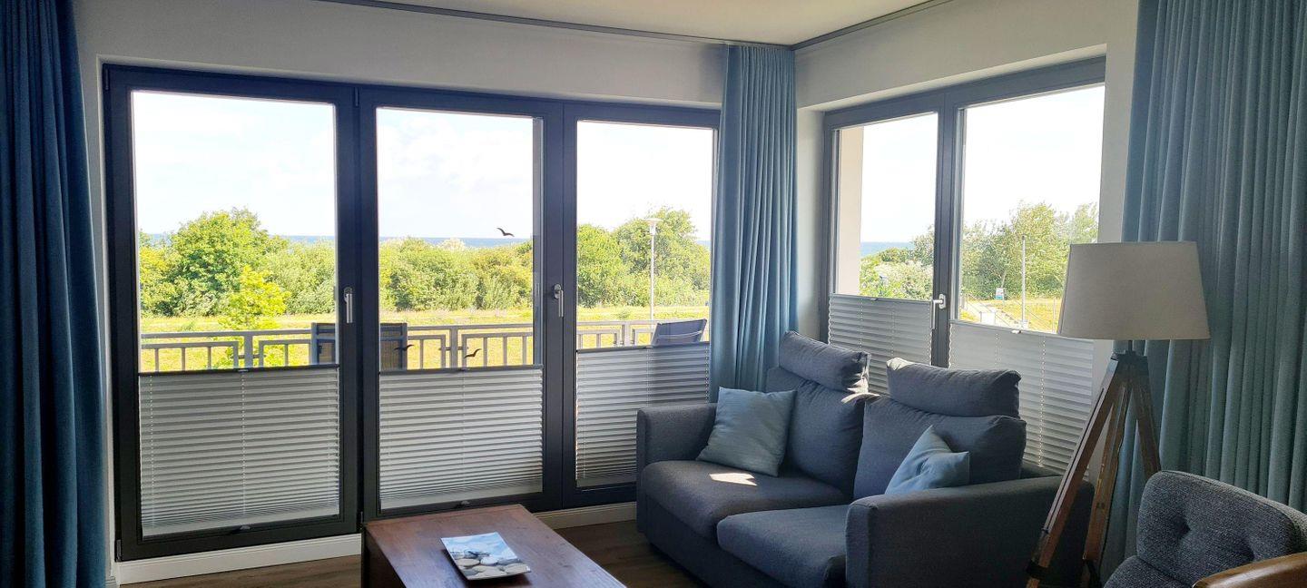 Die stilvoll modern eingerichtete 59 m² große Wohnung im ersten Obergeschoss ist für drei Personen und ein Kleinkind (bis 3 Jahre) geeignet. Mit einem traumhaften Blick auf die Ostsee lässt sie fast keine Wünsche offen. Genießen Sie einen unvergleichbaren Blick auf die Ostsee durch die großen Panoramafenster oder direkt vom Balkon. Der WOHNBEREICH empfängt Sie mit einer gemütlichen Schlafcouch (Liegefläche 140 x 200 cm) und einem modernen Gas- Kamin. Hier erleben sie auch in der kalten Jahreszeit unvergesslich schöne und erholsame Urlaubstage. Ein TV-Gerät mit integriertem DVD-Player, ein CD-Radio sowie eine kleine Bücher- und Spielesammlung stehen für die Unterhaltung zu Ihrer Verfügung. In der OFFENEN EINBAUKÜCHE finden Sie einen Hochbackofen, Cerankochfeld, Kühl- Gefrierkombination, Geschirrspüler, Mikrowelle, Kaffeemaschine, Wasserkocher und Toaster. Also alles, was Sie für die Zubereitung Ihrer Mahlzeiten benötigen. Ein Esstisch für den Verzehr ist selbstverständlich auch vorhanden. Genießen Sie die Ostseesonne und starten den Tag mit einem gemütlichen Frühstück (Beispielfoto) auf den bequemen Hochlehnern vom charmanten Balkon in Nord-Ost-Ausrichtung.