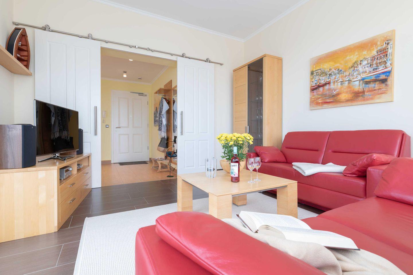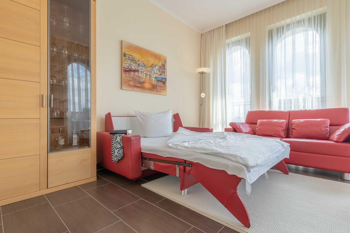 Treten Sie ein in den hellen, lichtdurchfluteten WOHNRAUM. Massivholzmöbeln aus Erlenholz geben dem Raum ein warmes angenehmes Flair. Hingucker ist die gemütliche Leder-Sitzgarnitur, welche in wenigen Handgriffen zu einer Schlafgelegenheit für eine dritte Person umgewandelt werden kann (Liegefläche 140 x 200 cm). Ein TV- Gerät und ein CD-Player sorgen für bunte Unterhaltung. Angrenzend an den Wohnbereich befindet sich der Essbereich mit voll eingerichteter OFFENER EINBAUKÜCHE (Geschirrspüler, Ceran-Kochfeld, Backofen, Kühlschrank mit Gefrierfach, Espressomaschine, Wasserkocher, Eierkocher und Toaster).
