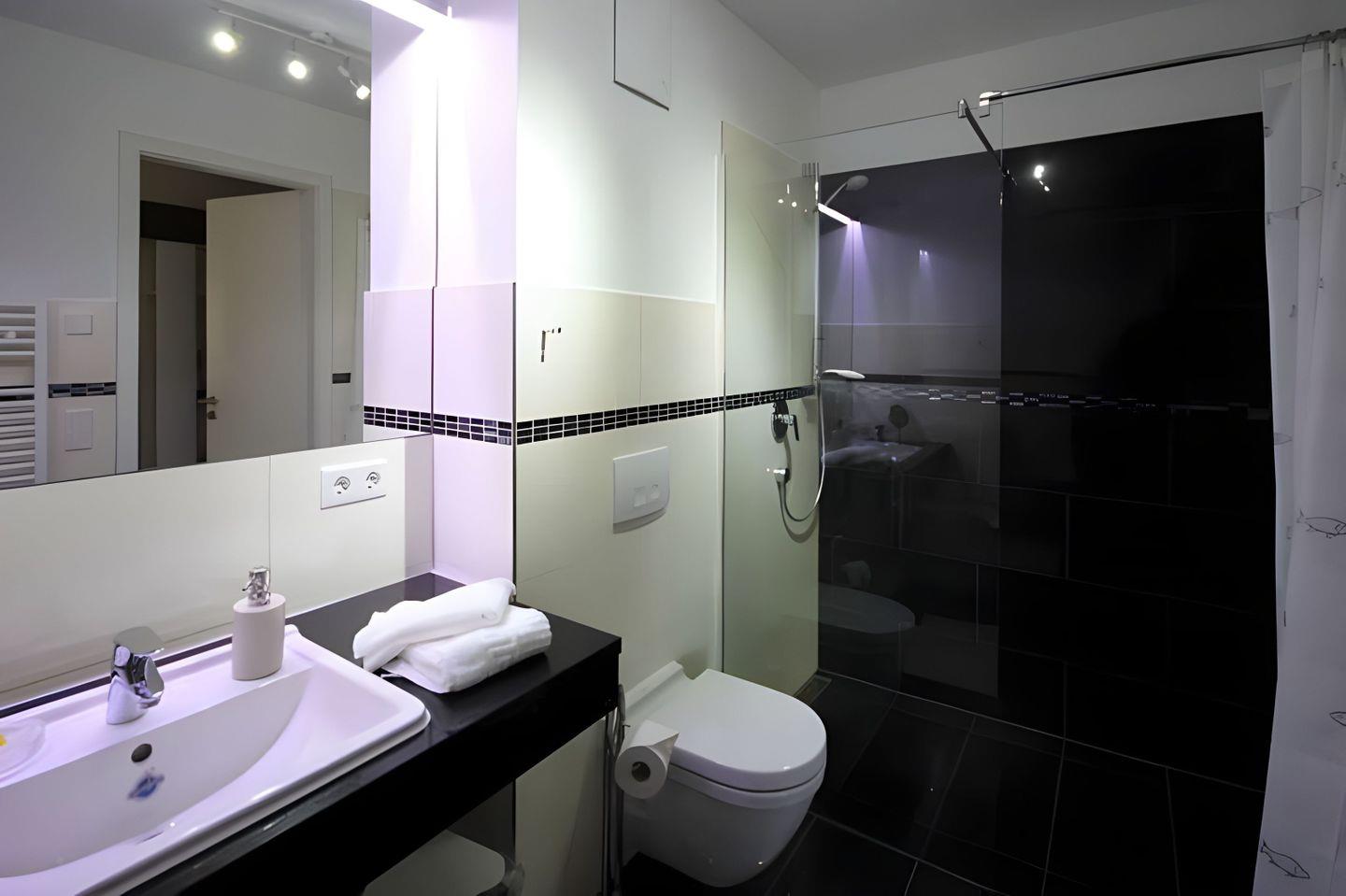 Waschtisch mit breitem Spiegel. Vom möbelierten Balkon mit Nord-Lage können Sie