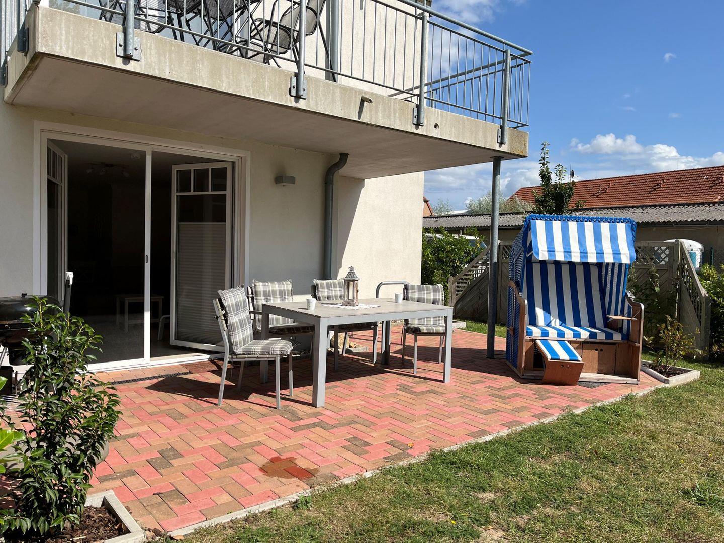 Die voll ausgestattete Küche mit Esstisch macht gemeinsame Mahlzeiten zum Vergnügen – vom Frühstück bis zum entspannten Abendessen. Vom Wohnbereich aus gelangen Sie direkt auf die sonnige Terrasse, wo Gartenmöbel und ein eigener Strandkorb auf Sie warten – perfekt für ruhige Stunden im Freien und lange Sommerabende.