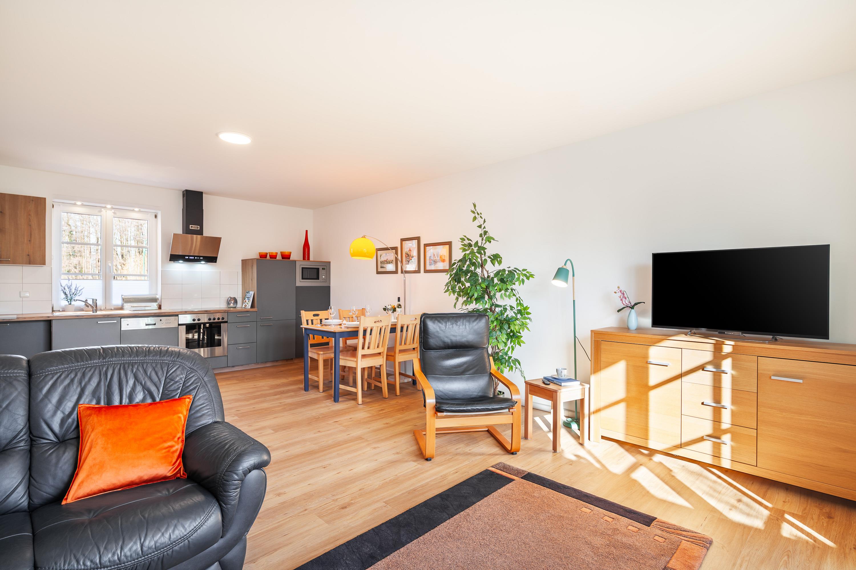 Besonders schön ist das helle, offene Wohn-und Esszimmer mit Zugang zur sonnigen Terrasse, einfach nur Urlaubsfeeling pur. In unmittelbarer Nähe befindet sich ein Brieftaubenschlag.