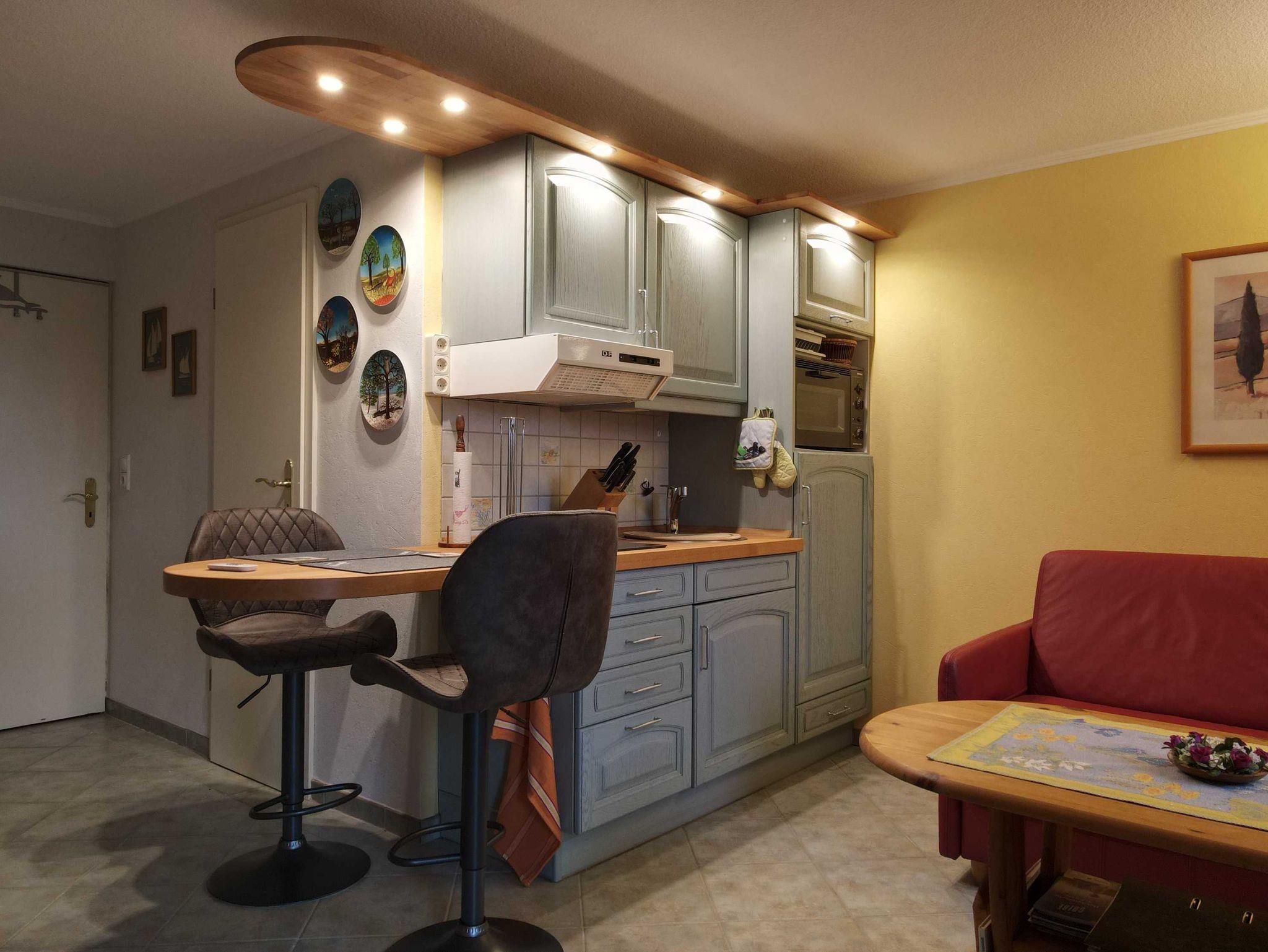 Die Ferienwohnung ist mit einem modernen Duschbad und einer Pantryküche mit Mikrowelle und Backofen sowie HD + TV und W-Lan-Internetzugang ausgestattet und verfügt über ein Doppelbett und ein Schlafsofa.