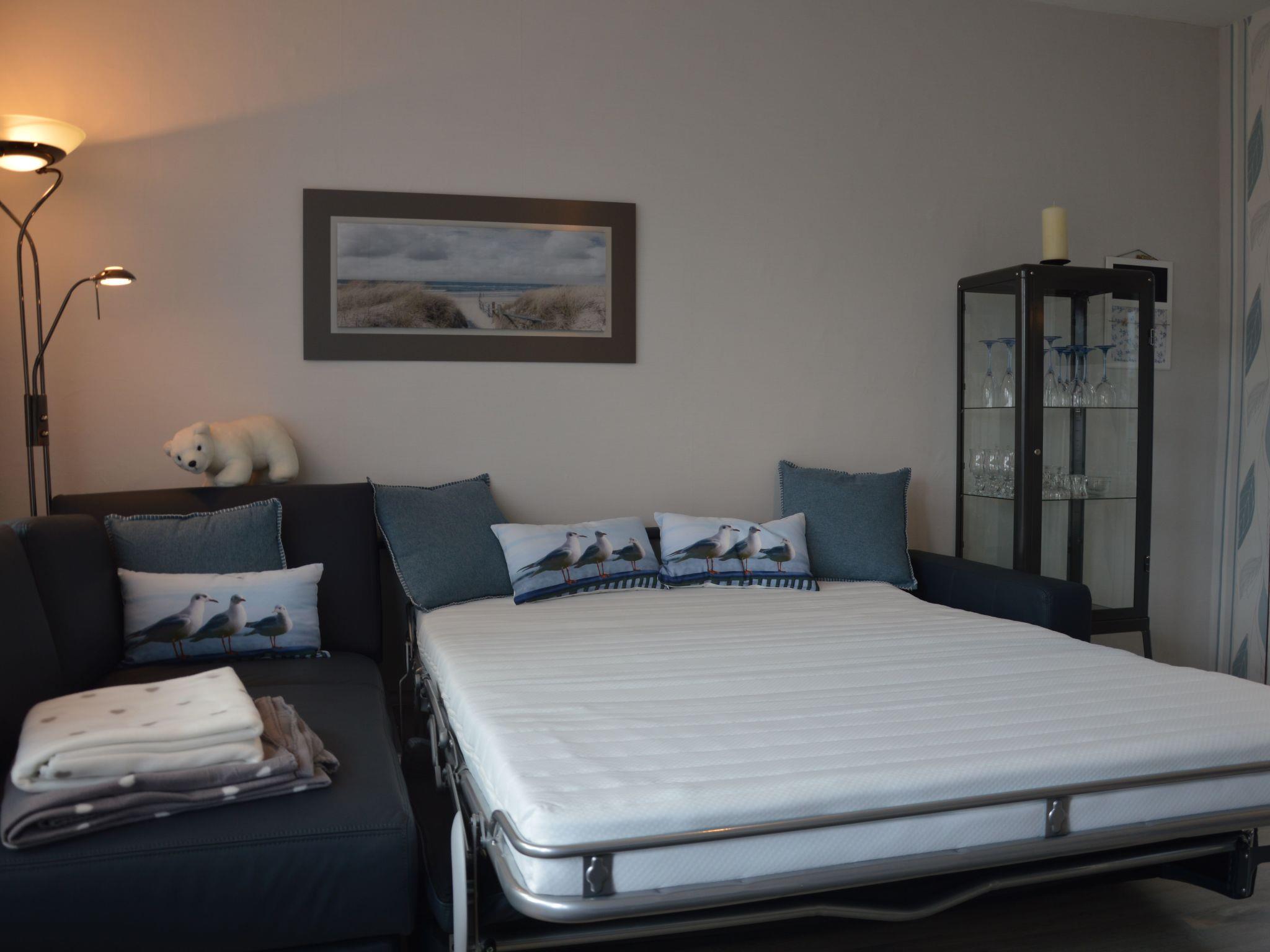 The "Silbermöwe" holiday flat is a lovingly furnished flat (mezzanine floor) in Büsum on the Perlebucht family lagoon. You can expect a friendly living room with a comfortable leather corner sofa that can be converted into a bed for 2 people (mattress). A large flat-screen TV, Blu-Ray player and a radio with CD player are available. The cosy dining area seats up to 4 people. The cosy pantry kitchen is functional and fully equipped. A coffee filter machine is available for making coffee. The bedroom is furnished with a double bed and a wardrobe. The cosy holiday flat is furnished in Scandinavian style and invites you to relax. Dogs are very welcome. Due to the size of the holiday flat, a maximum occupancy of 2 medium sized dogs is possible. Bed linen and towels can be booked for a fee.