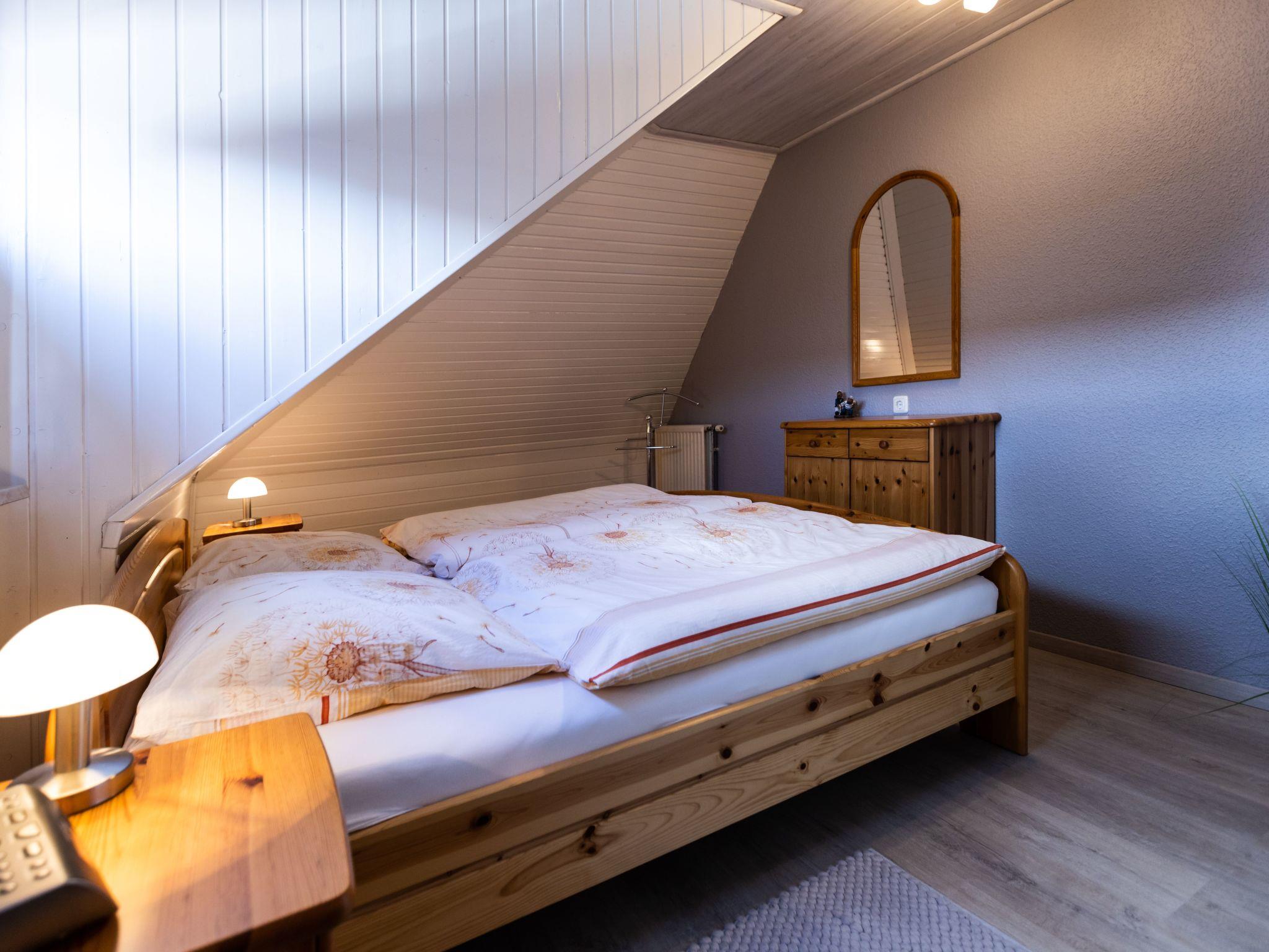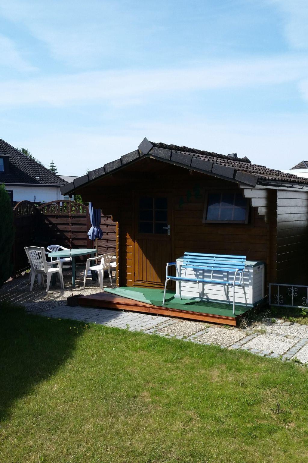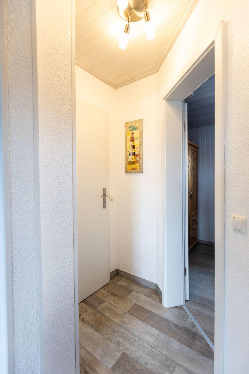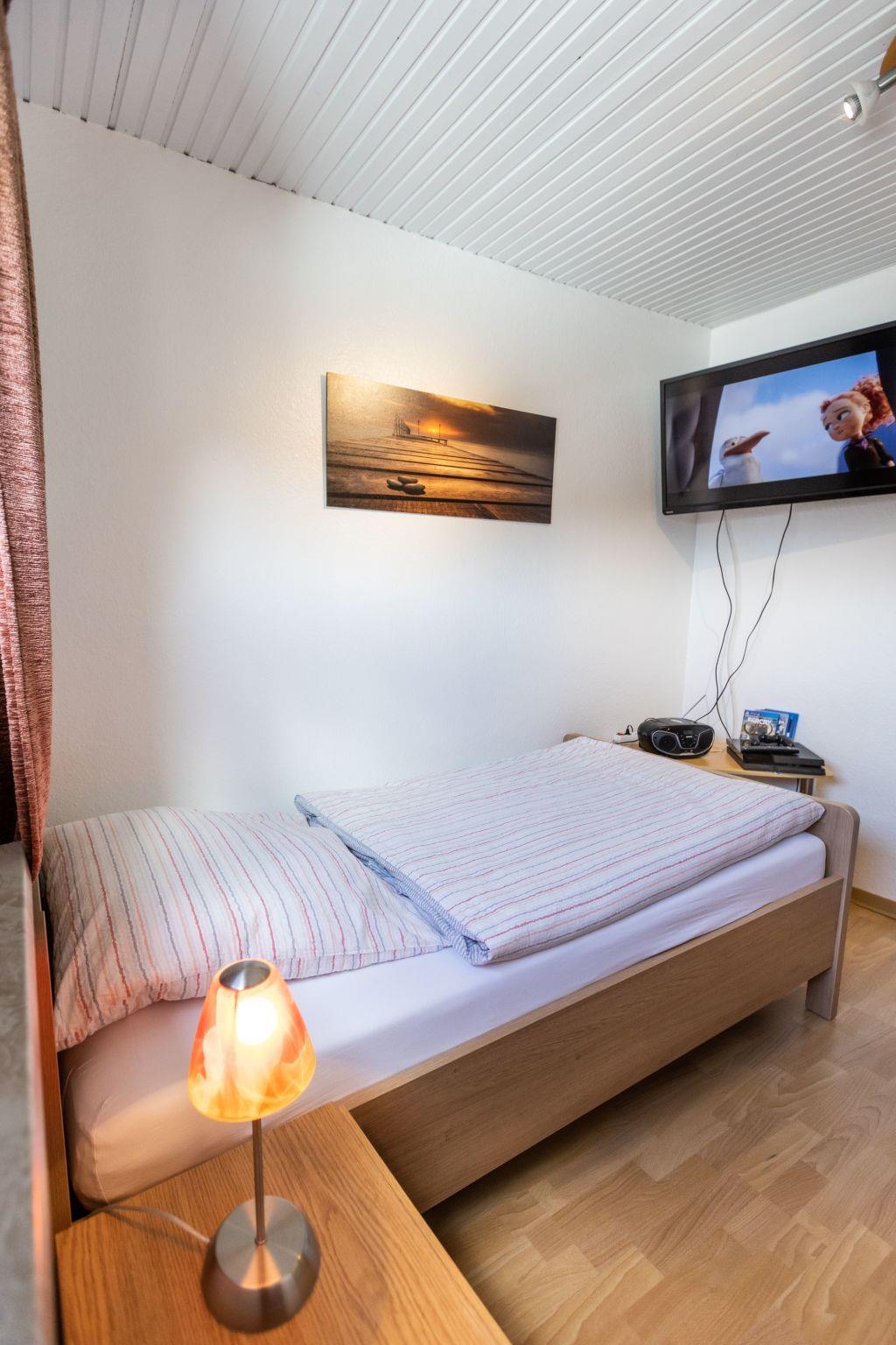 The holiday flat on the first floor, classified with four stars, has a living space of approx. 51 m². The accommodation is divided into a combined living and dining area with a fully equipped kitchenette, two bedrooms and a bathroom. The living area has an L-shaped sofa with coffee table, a floor lamp, a sideboard with a 40-inch flat-screen TV and a wardrobe. There is a dining table with three chairs in the centre of the room. In addition to the above-mentioned equipment, the fully equipped kitchen also has an oven and a dishwasher. The first bedroom has a double bed (2.00 x 2.00 m), a chest of drawers, a stool and a clock radio. The second bedroom is equipped with a single bed (1.00 x 2.00 m) and a TV, wardrobe and a chest of drawers.there is no possibility to charge an electric car for this the house electricity is not designed fire hazard. We have free W-Lan for you for failures and disturbances we assume no liability.