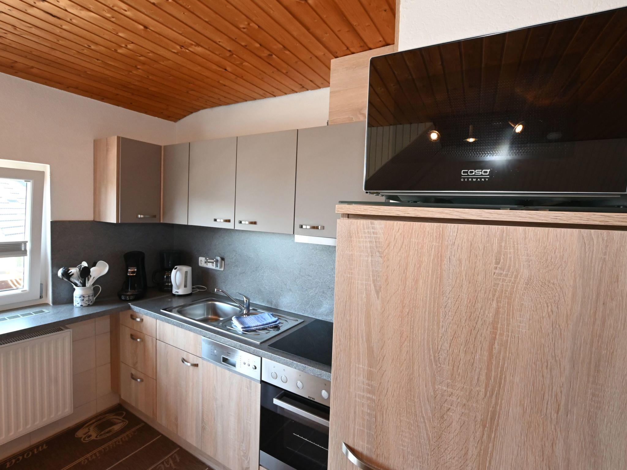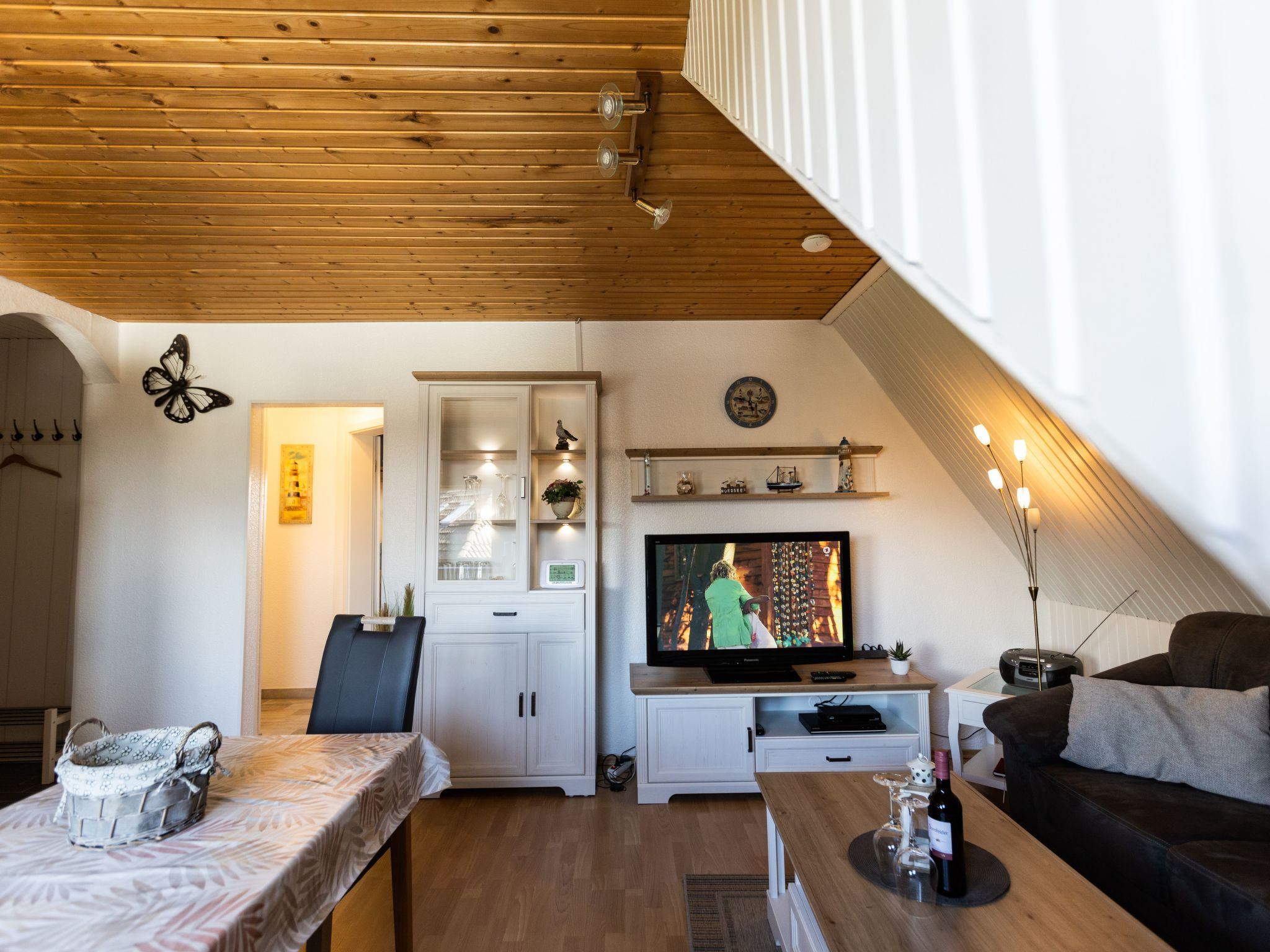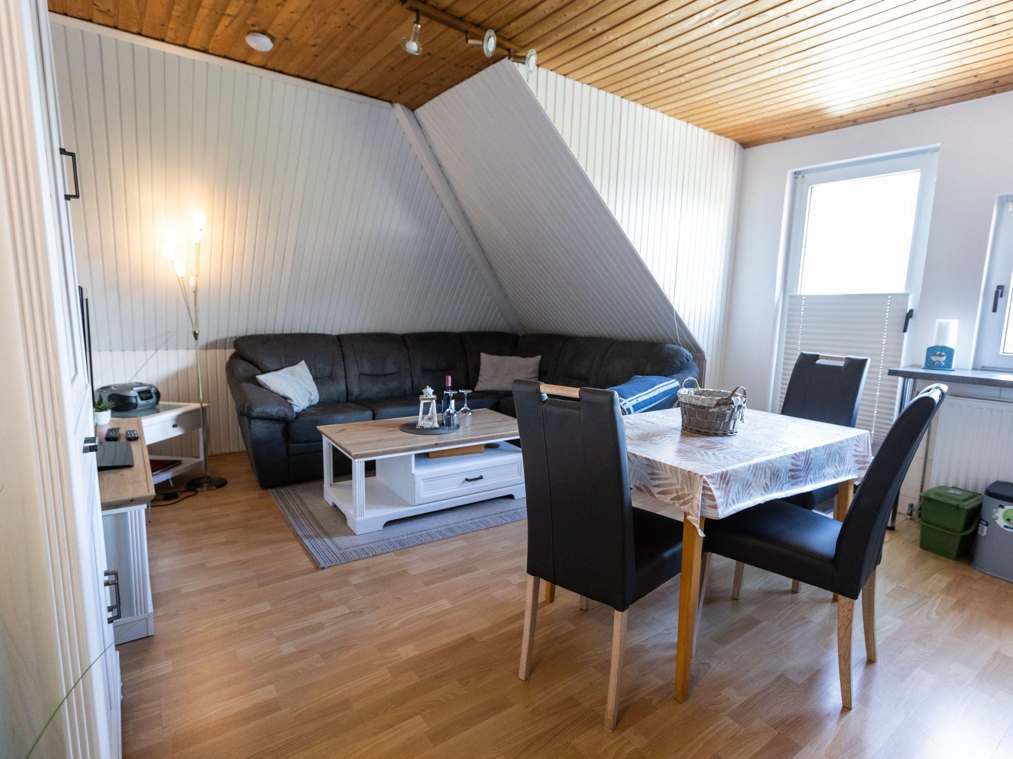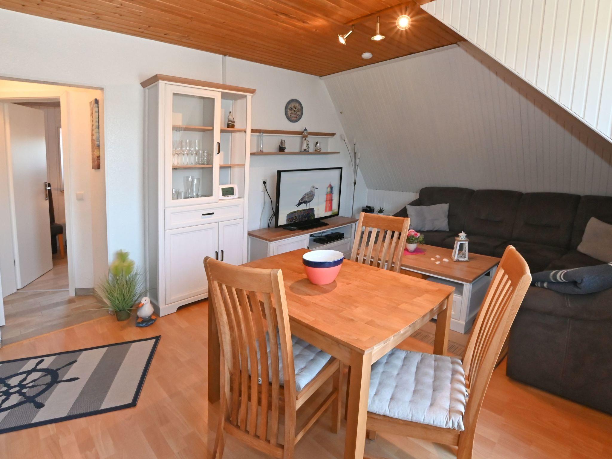 The holiday flat on the first floor, classified with four stars, has a living space of approx. 51 m². The accommodation is divided into a combined living and dining area with a fully equipped kitchenette, two bedrooms and a bathroom. The living area has an L-shaped sofa with coffee table, a floor lamp, a sideboard with a 40-inch flat-screen TV and a wardrobe. There is a dining table with three chairs in the centre of the room. In addition to the above-mentioned equipment, the fully equipped kitchen also has an oven and a dishwasher. The first bedroom has a double bed (2.00 x 2.00 m), a chest of drawers, a stool and a clock radio. The second bedroom is equipped with a single bed (1.00 x 2.00 m) and a TV, wardrobe and a chest of drawers.there is no possibility to charge an electric car for this the house electricity is not designed fire hazard. We have free W-Lan for you for failures and disturbances we assume no liability.