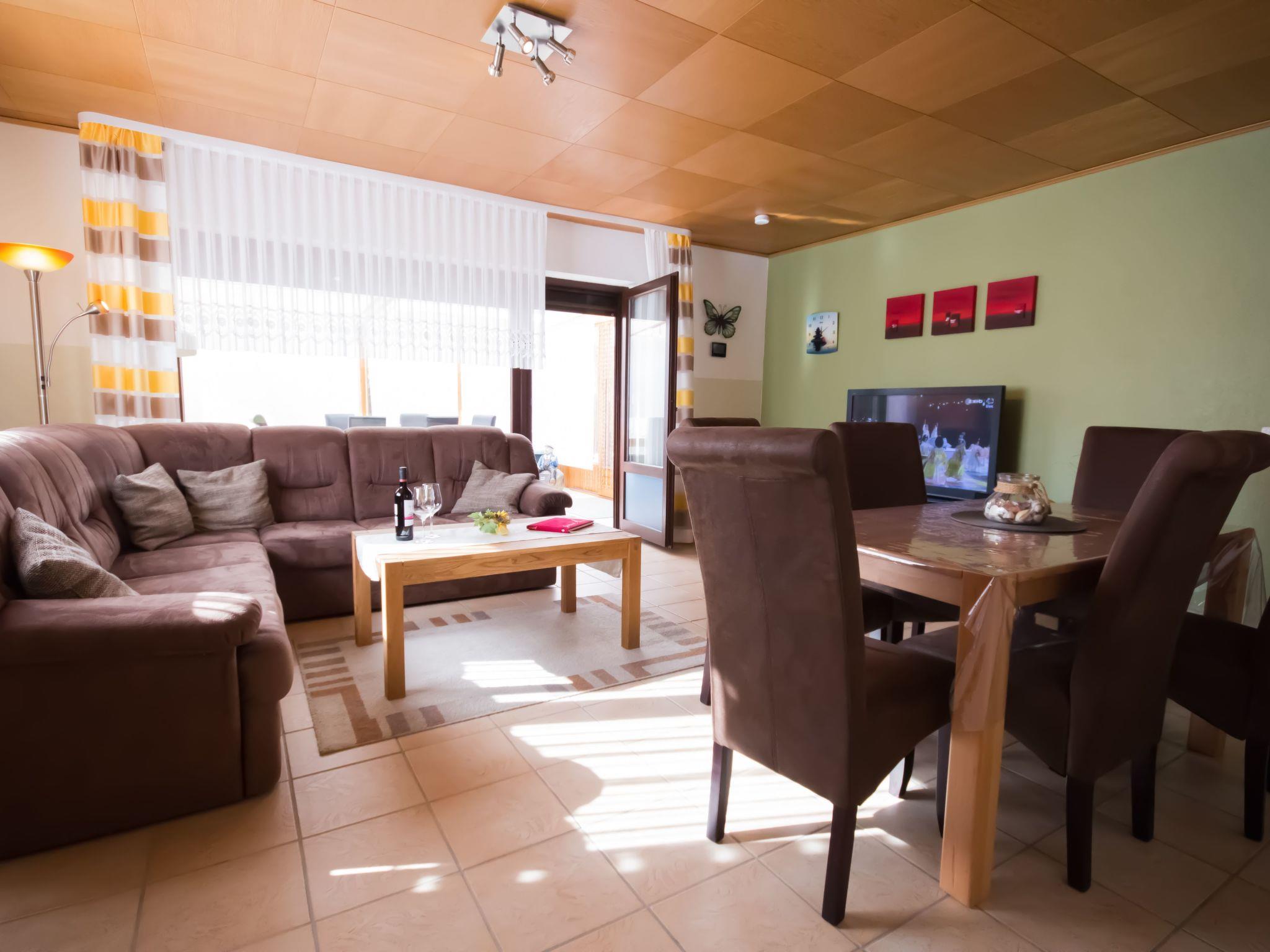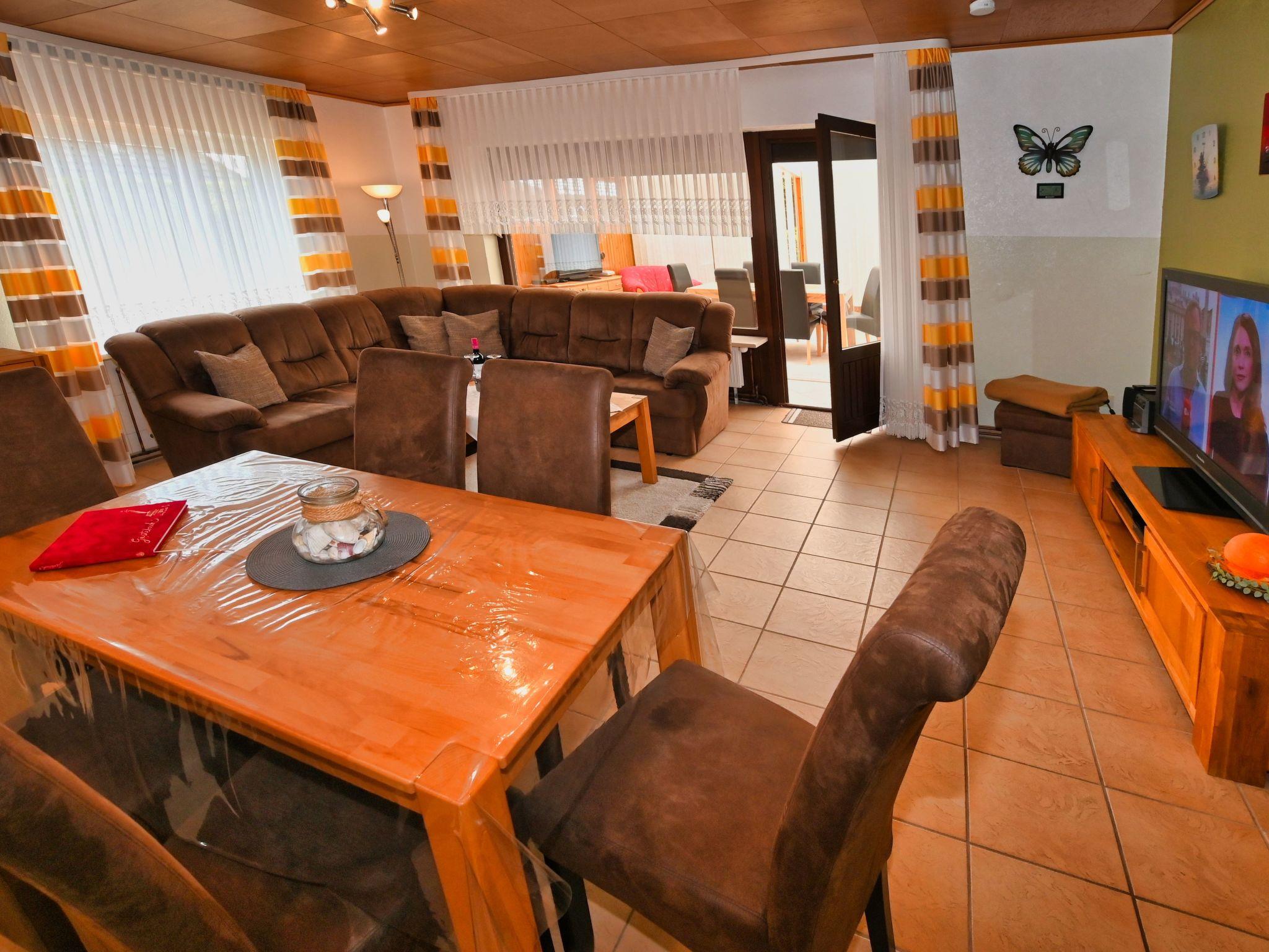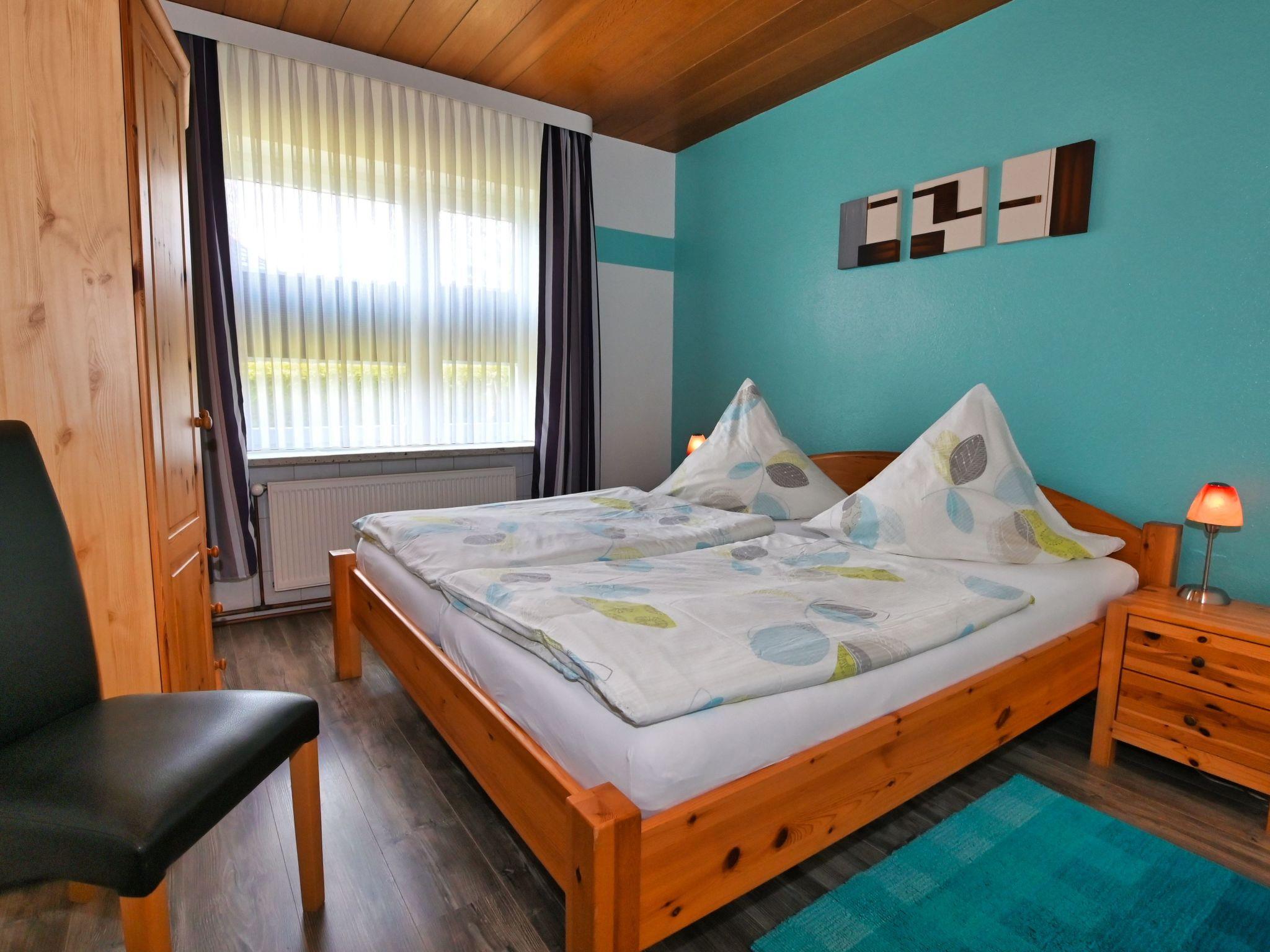 The 4-room flat has a living space of approx. 125 m². The friendly and comfortably furnished holiday accommodation extends over the entire ground floor. The modern living and dining area has a corner sofa with ottoman and coffee table, a floor lamp and a sideboard with a 50-inch flat-screen TV. There is also a dining table with six chairs. In addition to the above-mentioned equipment, the fully equipped kitchen also has an oven and a dishwasher. There is also a further dining area for two people. A high chair for children is available free of charge if required. The first bedroom is furnished with two single beds (0.90 x 2.00 m each). A CD player, a 23-inch TV and a stool round off the furnishings in this sleeping area. The second bedroom has a double bed (1.80 x 2.00 m) and an optional cot (0.70 x 1.40 m) for free use, as well as a clock radio and a stool. The third bedroom also has a double bed (1.80 x 2.00 m) with a stool provided. Compared to the other flats, this bathroom also has underfloor heating, a towel radiator as well as a urinal, bidet and shower stool. The separate guest WC is equipped with a washbasin, toilet and mirror. In the storage room there is a washing machine for your exclusive use free of charge, as well as a clothes horse, ironing board, iron and hoover. You will find a cloakroom, a wardrobe and a mirror in the hallway. We have free W-Lan for you. We assume no liability for failures and malfunctions.