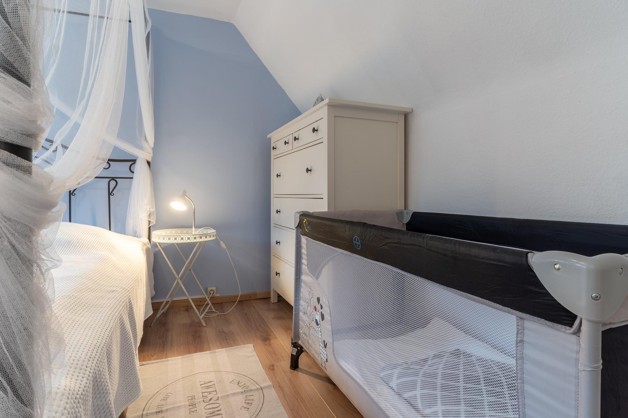 Velkommen til en indbydende 3-værelses ikke-ryger ferielejlighed, ideelt beliggende i forreste del af et lejlighedshus med i alt fire ferielejligheder. Denne rummelige bolig med gratis WiFi kan rumme op til 5 personer og er perfekt til familier eller små grupper. I stueetagen finder du en komfortabel stue og spisestue med pejs og en hyggelig sovesofa, perfekt til at slappe af efter en begivenhedsrig dag. Det fuldt udstyrede køkken er ideelt til madlavning og har ovn, køleskab med fryser, opvaskemaskine, mikroovn og kaffemaskine. Alt hvad du behøver for at forkæle dig selv og dine kære. Badeværelset i stueetagen er udstyret med bruseniche, toilet og håndvask. På anden sal er der to soveværelser, det ene med en komfortabel dobbeltseng og det andet med to enkeltsenge. Der er også et ekstra toilet med håndvask. Parkering er tilgængelig i gården eller på gaden, og der er et cykelskur til dine cykler. Et vaskerum med vaskemaskine og tørretumbler til almindelig brug (mod betaling) er også tilgængelig. Højdepunkter inkluderet: Alle forbrugsbaserede energiomkostninger, sengelinned, håndklæder og slutrengøring WiFi Parkeringsplads Din feriebolig er i Büsum, en charmerende kystby kendt for sin friske Nordsøluft og afslappede atmosfære. Undslip hverdagens stress og nyd de rolige omgivelser, uanset om du er på lange gåture på stranden, cykler eller bare lytter til havets brusen. Byens centrum med sine restauranter, caféer og indkøbsmuligheder ligger kun en kort gåtur væk. Den maleriske havn og strand er også inden for nem gåafstand. Hvis du gerne vil udforske det omkringliggende område, kan du tage på ture til de nærliggende øer.