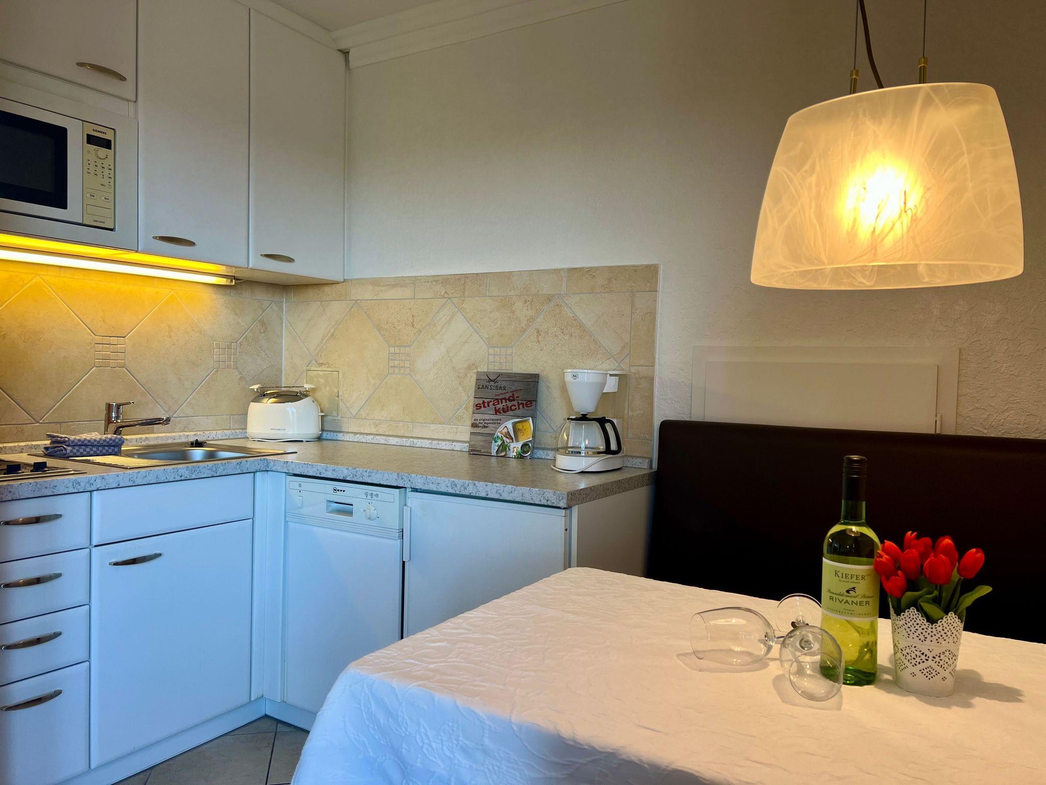 • Die Küchenzeile verfügt über einen Herd mit 2 Kochplatten und Dunstabzugshaube, Mikrowellengerät, Kaffeemaschine, Wasserkocher, Toaster, Kühlschrank mit Gefrierfach, Geschirrspüler. Selbstverständlich ist eine komplette Ausstattung mit Geschirr, Bestecken, Töpfen etc. vorhanden.