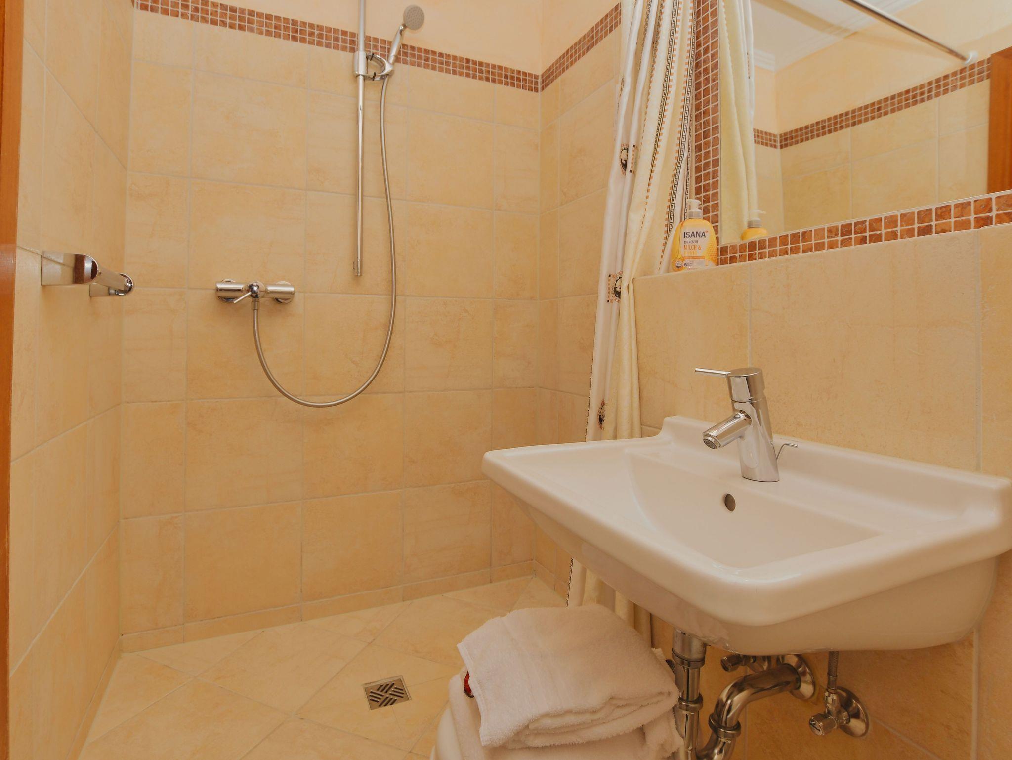 • Duschbad/WC, Waschtisch, großer Spiegel, ausreichend Ablageflächen.