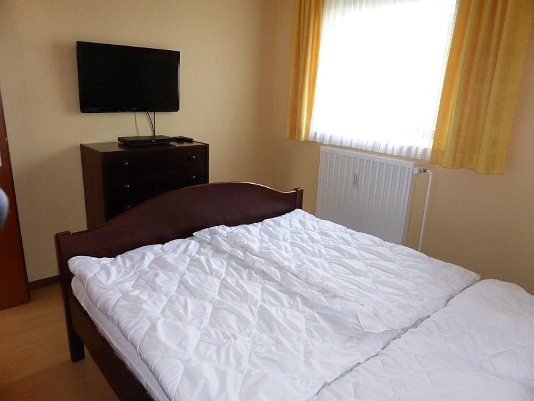 Im Schlafzimmer mit Doppelbett und großzügigem Kleiderschrank befindet sich ein zusätzlicher Flachbild-TV mit DVD Player.