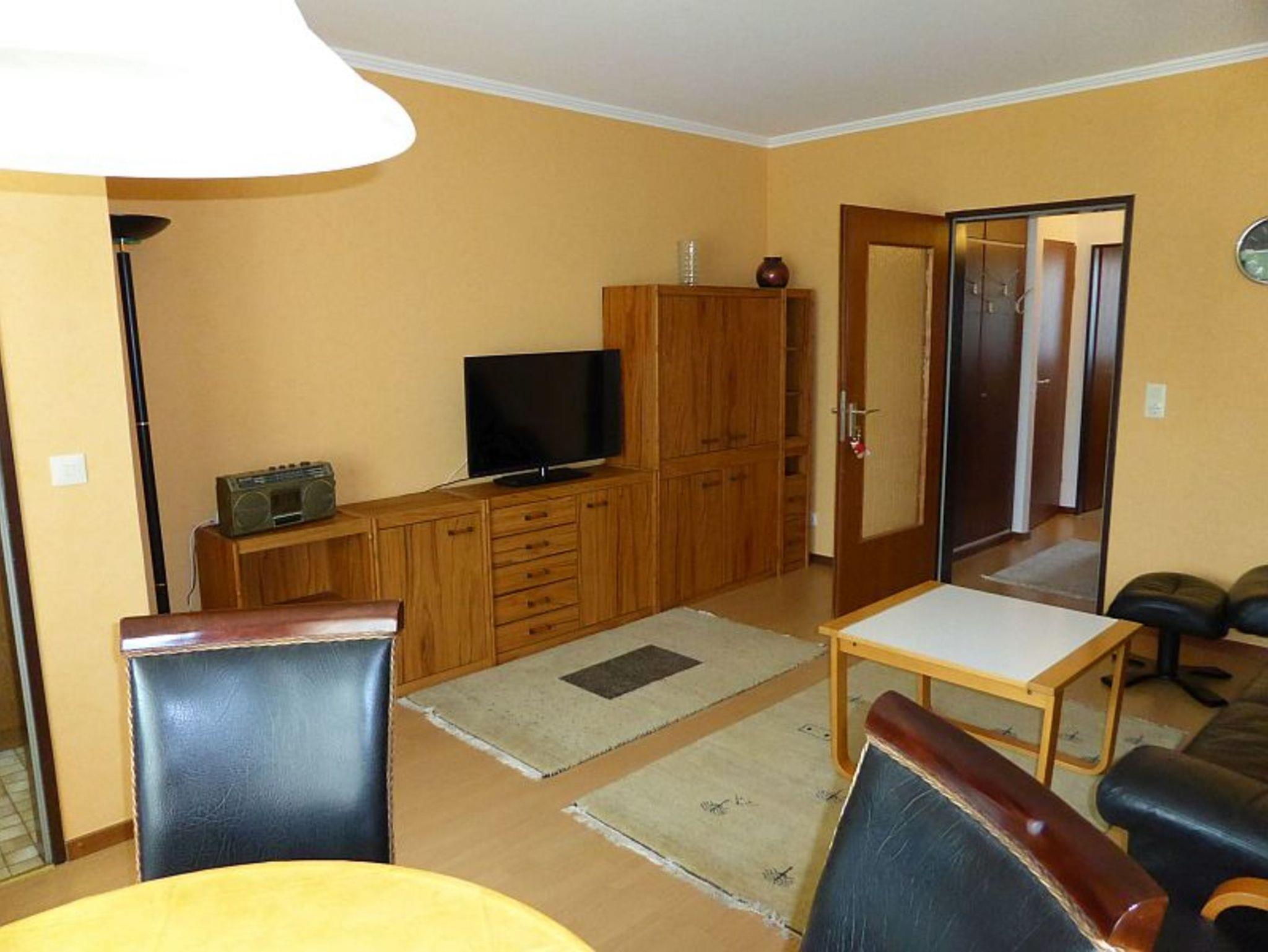 Im Wohnzimmer gibt es eine gemütliche Sitzgarnitur, einen Eßplatz direkt am Fenster und einen Flachbild TV mit Kabelanschluß.