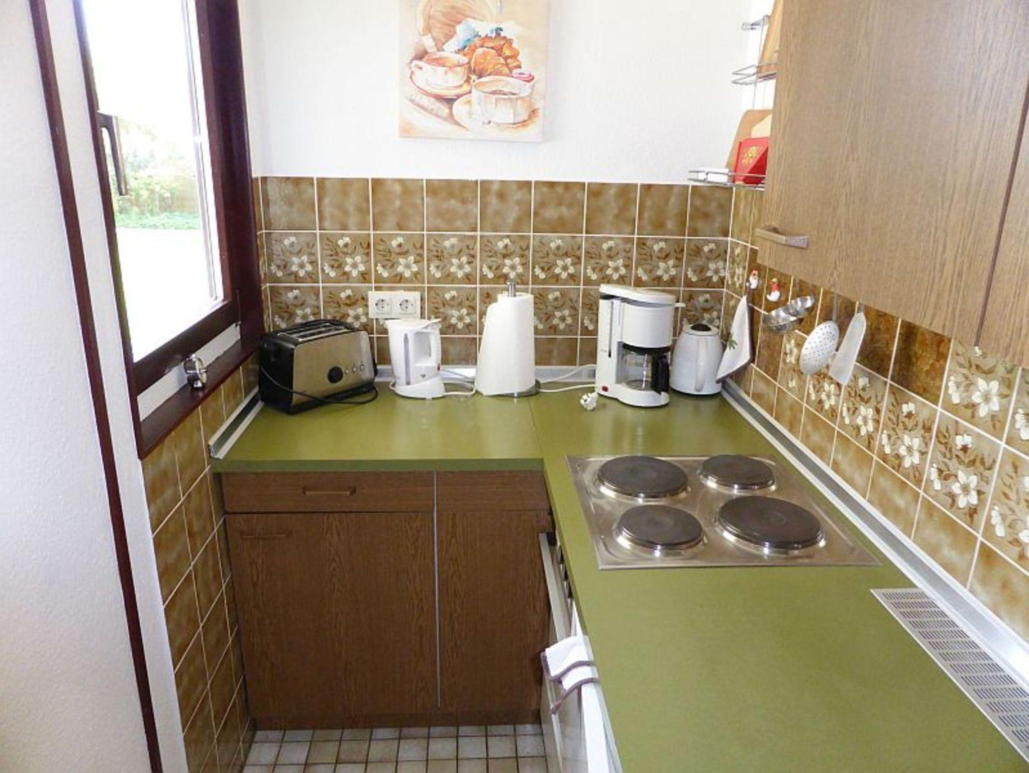 Die separate Küche ist komplett eingerichtet mit Backofen, 4 Kochplatten, Kühlschrank, Kaffemaschine, Wasserkocher, Toaster, Geschirr, Besteck, Töpfen, usw.