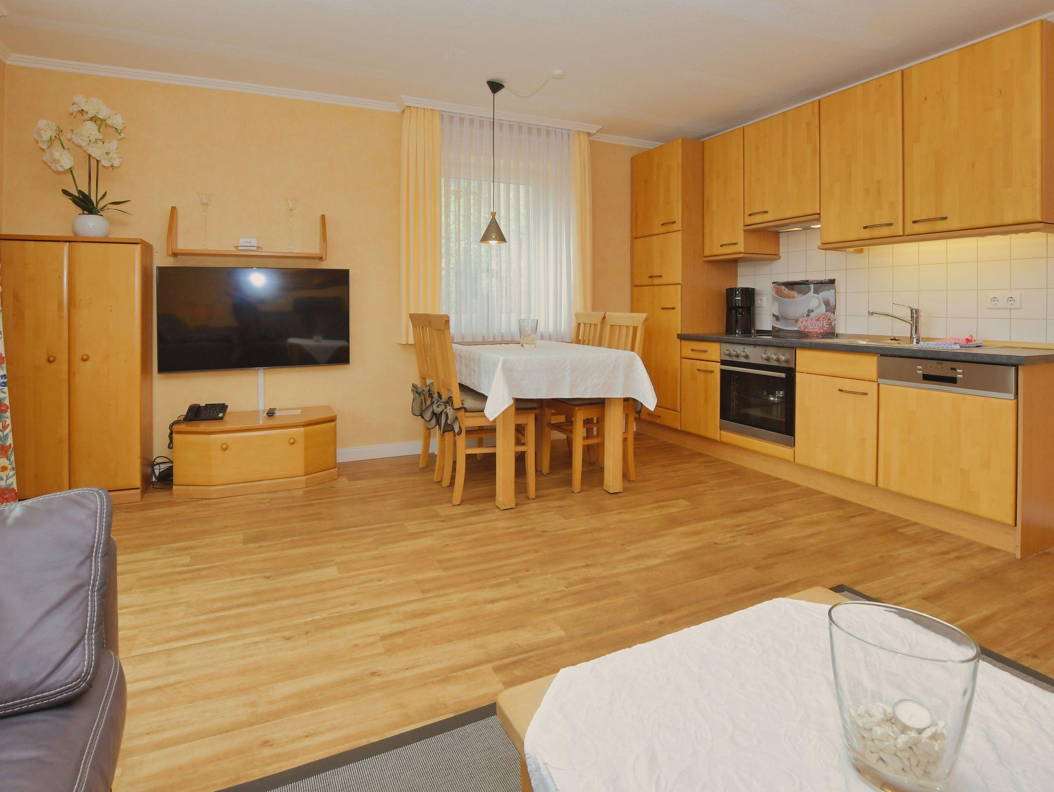 • Wohnzimmer mit hochwertiger Schlafcouch, Sitzgruppe, Fernseher, Stereoanlage, Eßplatz und Küchenzeile.