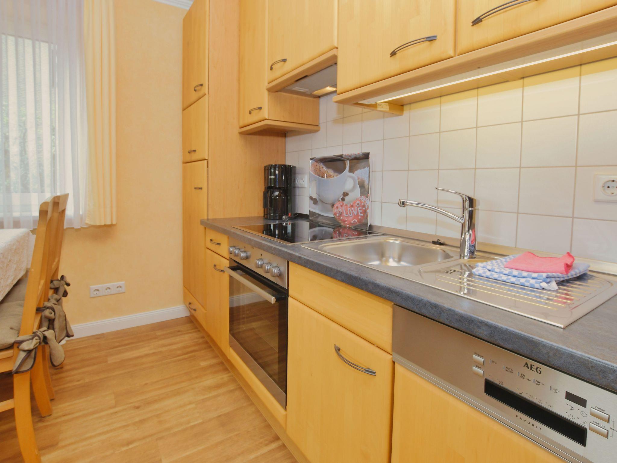 Moderne Küchenzeile mit Backofen, Grill, Mikrowelle, Dunstabzugshaube, Geschirrspüler, Kühlschrank mit Gefrierfach, 4- Kochfeldherd, Kaffeemaschine und sonstigen Küchengeräten. Die Küche ist komplett bestückt mit Geschirr, Bestecken, Töpfen, etc.