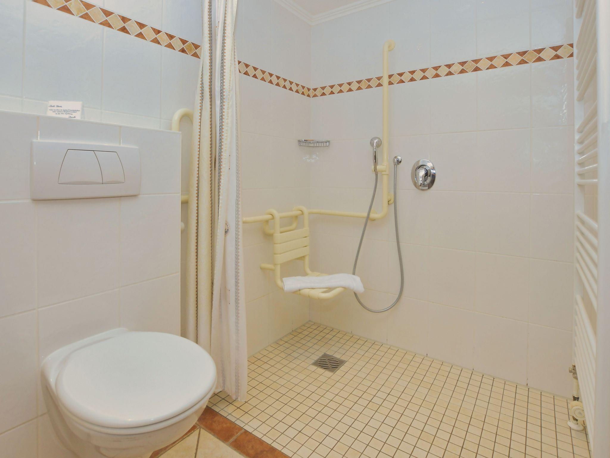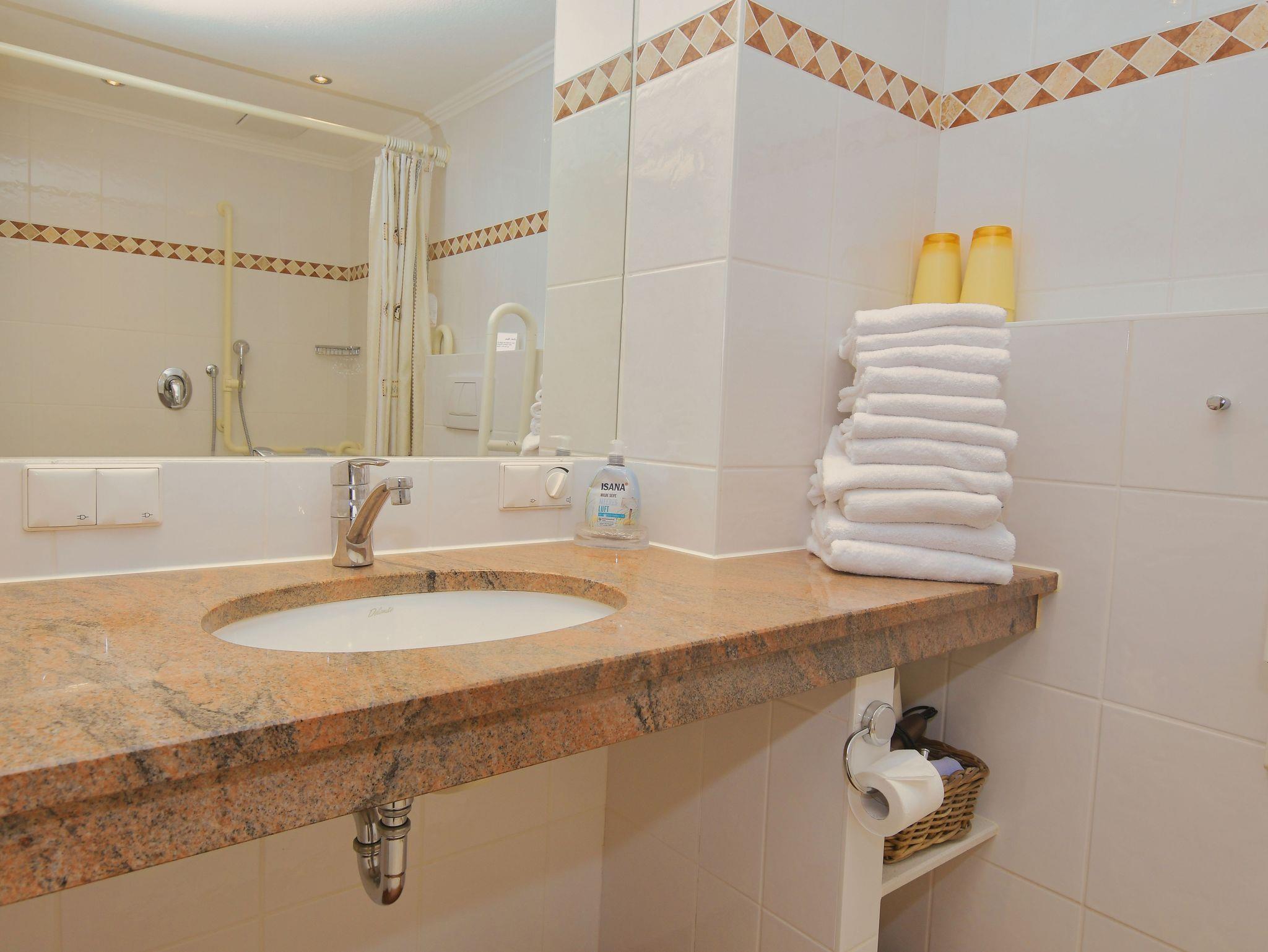 Modernes Bad - behindertengerecht ausgestattet - mit Dusche, WC, Bidet, großem Waschtisch mit Spiegel, ausreichend Ablageflächen, Fußbodenheizung, Handtuchtrockner und Radio.