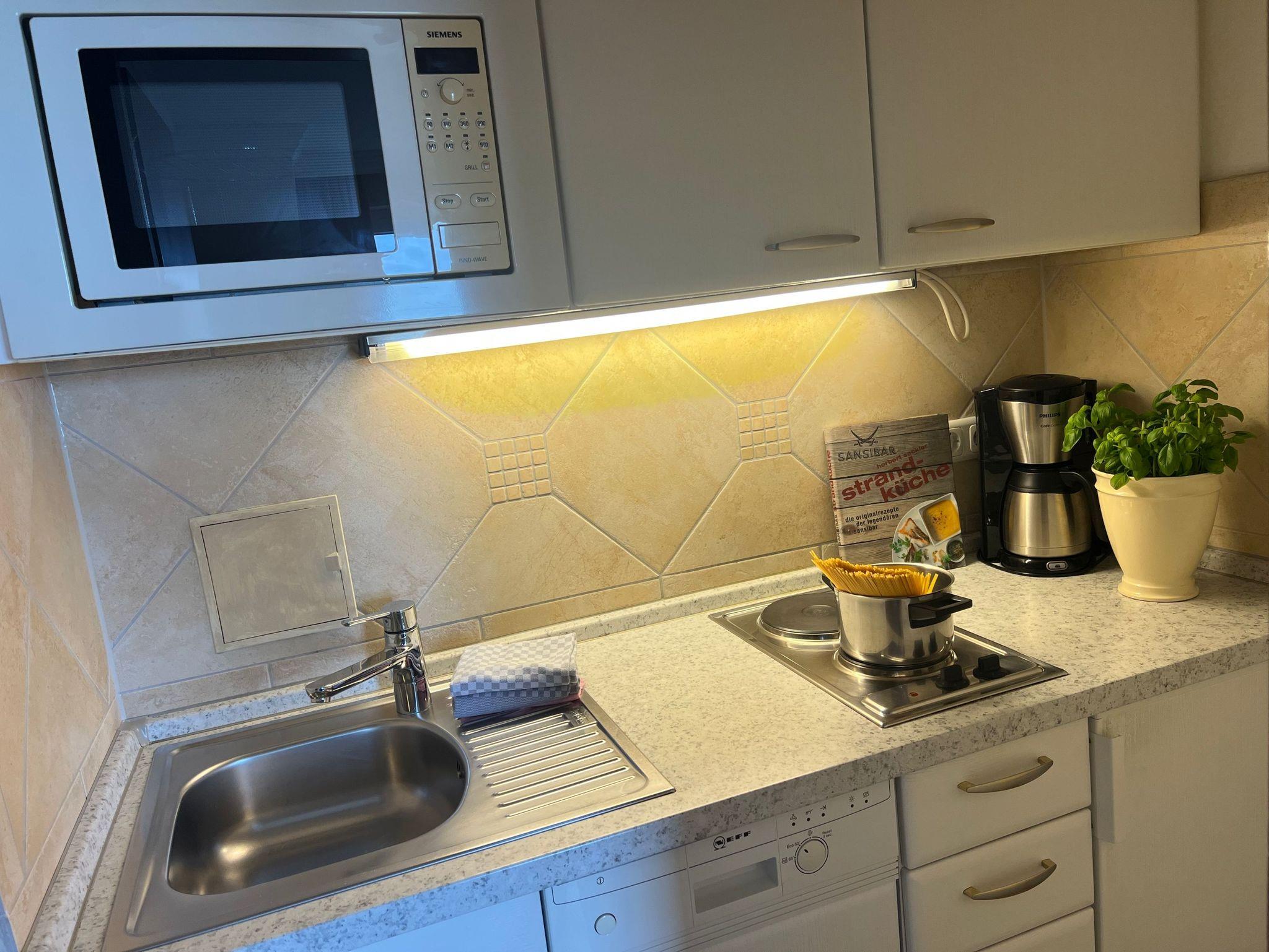 • Küche mit 2 Kochplatten, Dunstabzug, Spüle, Spülmaschine, Kühlschrank mit Gefrierfach, Kombigerät Mikrowelle/Backofen, Kaffeemaschine, Toaster und Wasserkocher. Die Küche ist komplett bestückt mit Geschirr, Bestecken, Töpfen, etc.