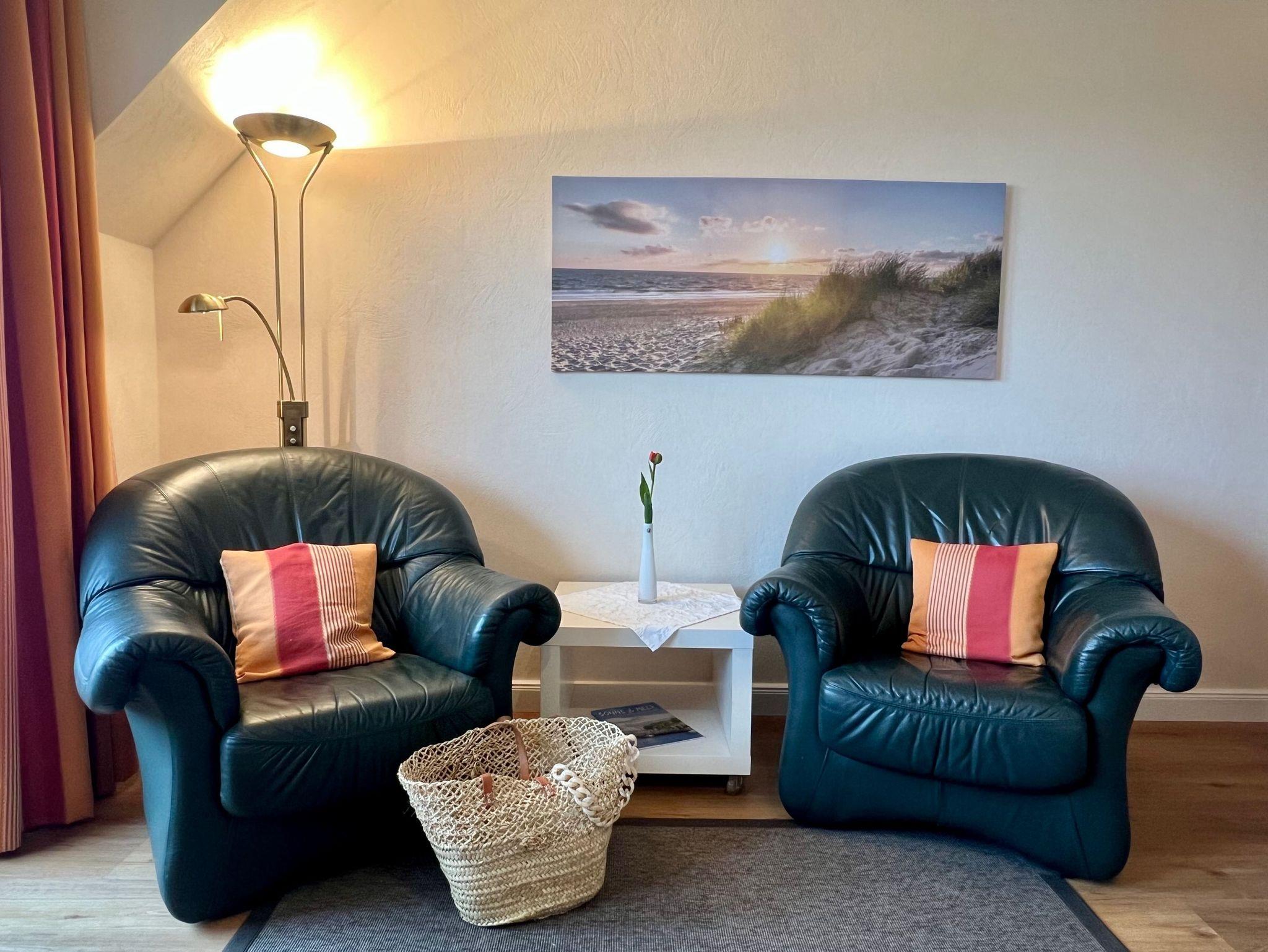 • Kombinierter Wohn-Schlafraum mit großem Doppelbett, 2 Sesseln, Esstisch mit Stühlen, SAT-TV, Stereoanlage, Balkon nach Südwesten mit Gartenmöbeln.