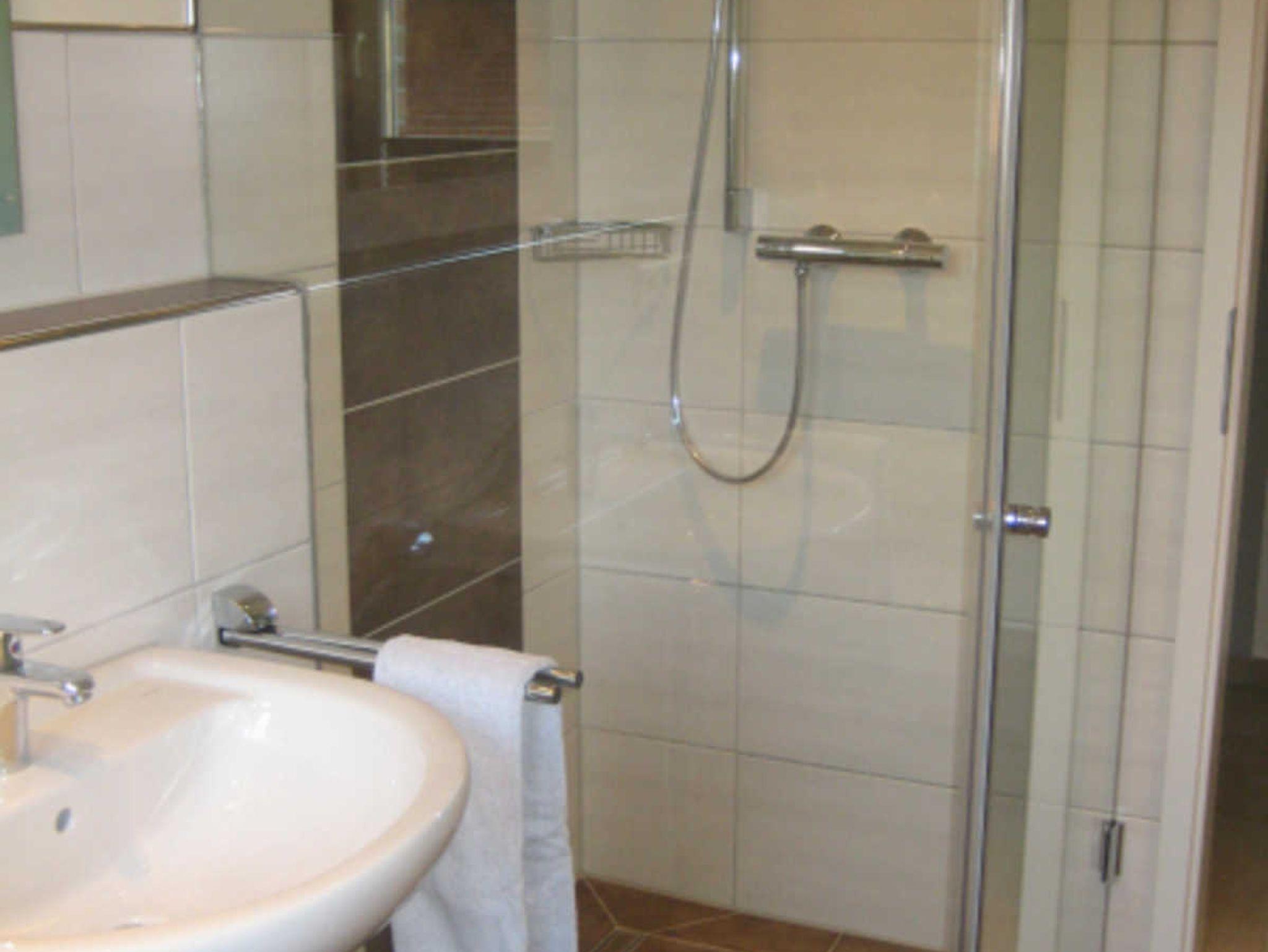 • Das modern eingerichtete Tageslicht-Badezimmer ist mit Waschbecken, bodengleicher Dusche und WC ausgestattet.