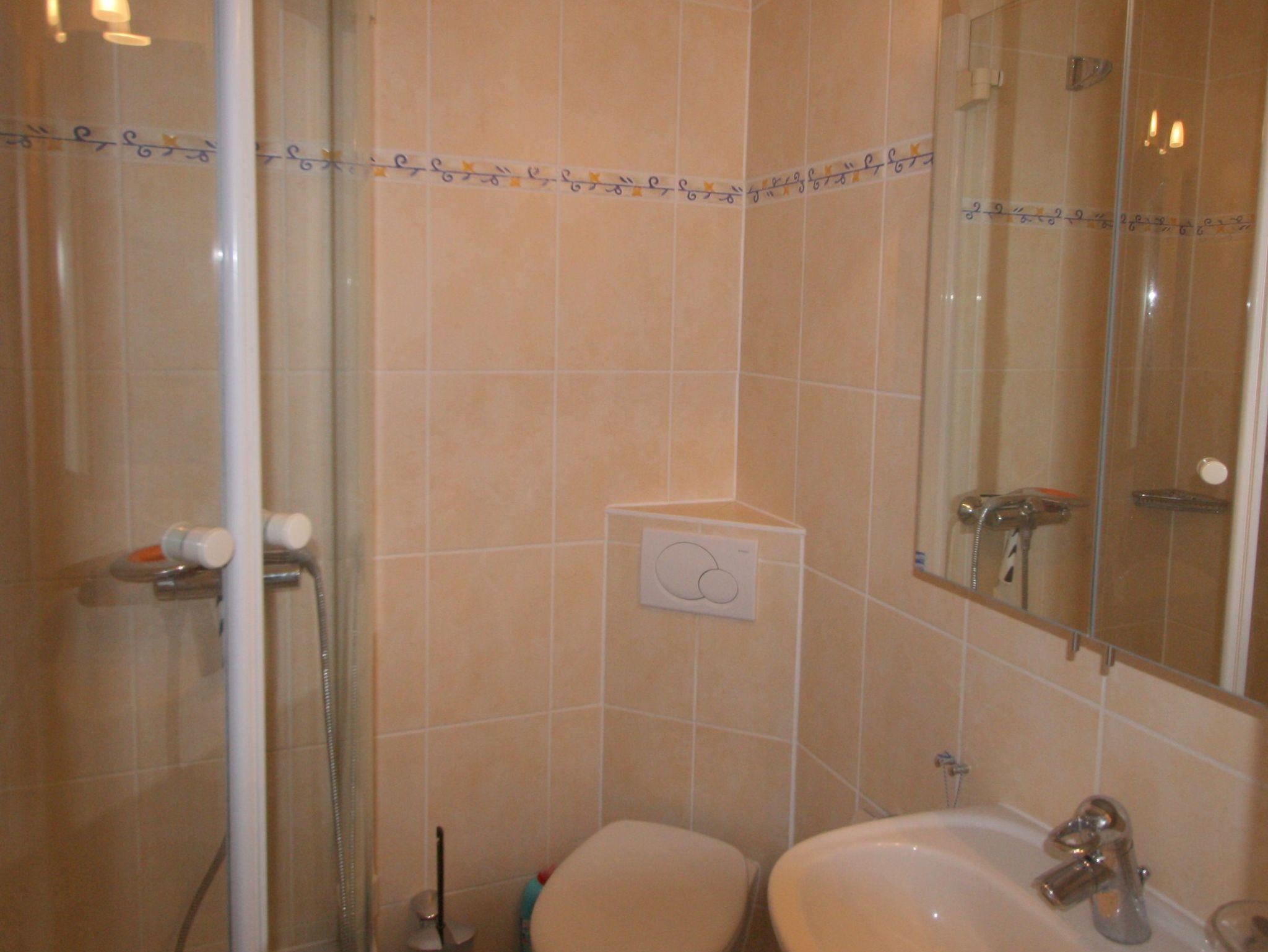 Das Badezimmer ist mit einer Dusche, Waschbecken und WC ausgestattet. Ein Haarfön ist vorhanden.