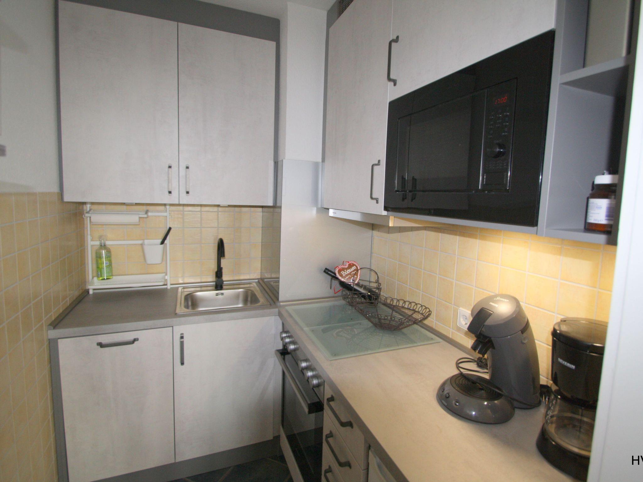 Die neue Einbauküche verfügt über einen Geschirrspüler, einen Herd mit 4 Cerankochfeldern und Backofen, Kühlschrank mit kl. Gefrierfach, Mikrowelle, Kaffeemaschine , Senseo-Pad-Kaffeemaschine, Wasserkocher, umfangreichen Küchenutensilien und ausreichend Geschirr.